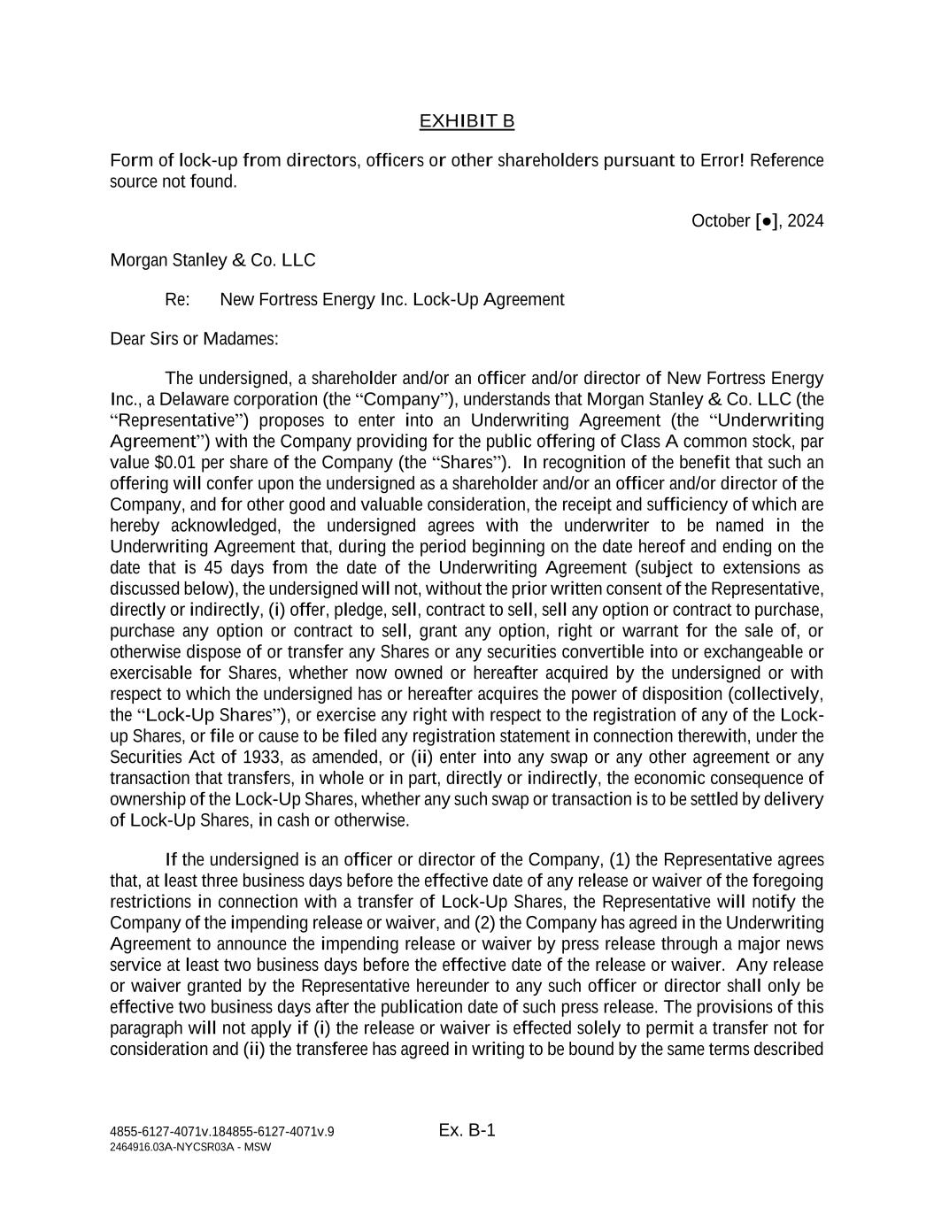 4855-6127-4071v.184855-6127-4071v.9 Ex. B-1 2464916.03A-NYCSR03A - MSW EXHIBIT B Form of lock-up from directors, officers or other shareholders pursuant to Error! Reference source not found. October [●], 2024 Morgan Stanley & Co. LLC Re: New Fortress Energy Inc. Lock-Up Agreement Dear Sirs or Madames: The undersigned, a shareholder and/or an officer and/or director of New Fortress Energy Inc., a Delaware corporation (the “Company”), understands that Morgan Stanley & Co. LLC (the “Representative”) proposes to enter into an Underwriting Agreement (the “Underwriting Agreement”) with the Company providing for the public offering of Class A common stock, par value $0.01 per share of the Company (the “Shares”). In recognition of the benefit that such an offering will confer upon the undersigned as a shareholder and/or an officer and/or director of the Company, and for other good and valuable consideration, the receipt and sufficiency of which are hereby acknowledged, the undersigned agrees with the underwriter to be named in the Underwriting Agreement that, during the period beginning on the date hereof and ending on the date that is 45 days from the date of the Underwriting Agreement (subject to extensions as discussed below), the undersigned will not, without the prior written consent of the Representative, directly or indirectly, (i) offer, pledge, sell, contract to sell, sell any option or contract to purchase, purchase any option or contract to sell, grant any option, right or warrant for the sale of, or otherwise dispose of or transfer any Shares or any securities convertible into or exchangeable or exercisable for Shares, whether now owned or hereafter acquired by the undersigned or with respect to which the undersigned has or hereafter acquires the power of disposition (collectively, the “Lock-Up Shares”), or exercise any right with respect to the registration of any of the Lock- up Shares, or file or cause to be filed any registration statement in connection therewith, under the Securities Act of 1933, as amended, or (ii) enter into any swap or any other agreement or any transaction that transfers, in whole or in part, directly or indirectly, the economic consequence of ownership of the Lock-Up Shares, whether any such swap or transaction is to be settled by delivery of Lock-Up Shares, in cash or otherwise. If the undersigned is an officer or director of the Company, (1) the Representative agrees that, at least three business days before the effective date of any release or waiver of the foregoing restrictions in connection with a transfer of Lock-Up Shares, the Representative will notify the Company of the impending release or waiver, and (2) the Company has agreed in the Underwriting Agreement to announce the impending release or waiver by press release through a major news service at least two business days before the effective date of the release or waiver. Any release or waiver granted by the Representative hereunder to any such officer or director shall only be effective two business days after the publication date of such press release. The provisions of this paragraph will not apply if (i) the release or waiver is effected solely to permit a transfer not for consideration and (ii) the transferee has agreed in writing to be bound by the same terms described