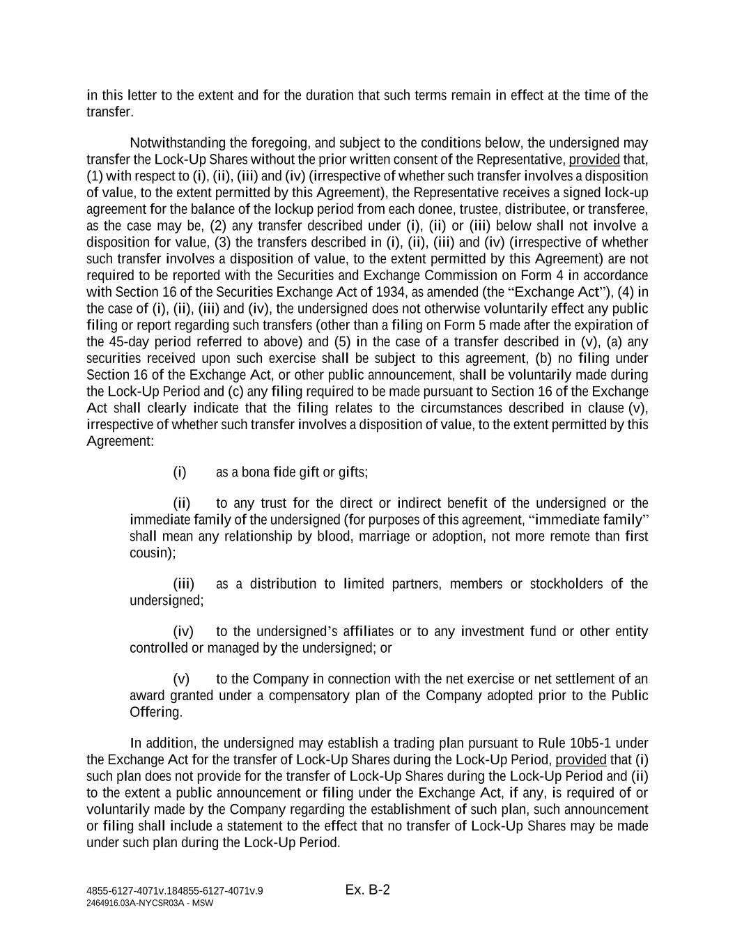 4855-6127-4071v.184855-6127-4071v.9 Ex. B-2 2464916.03A-NYCSR03A - MSW in this letter to the extent and for the duration that such terms remain in effect at the time of the transfer. Notwithstanding the foregoing, and subject to the conditions below, the undersigned may transfer the Lock-Up Shares without the prior written consent of the Representative, provided that, (1) with respect to (i), (ii), (iii) and (iv) (irrespective of whether such transfer involves a disposition of value, to the extent permitted by this Agreement), the Representative receives a signed lock-up agreement for the balance of the lockup period from each donee, trustee, distributee, or transferee, as the case may be, (2) any transfer described under (i), (ii) or (iii) below shall not involve a disposition for value, (3) the transfers described in (i), (ii), (iii) and (iv) (irrespective of whether such transfer involves a disposition of value, to the extent permitted by this Agreement) are not required to be reported with the Securities and Exchange Commission on Form 4 in accordance with Section 16 of the Securities Exchange Act of 1934, as amended (the “Exchange Act”), (4) in the case of (i), (ii), (iii) and (iv), the undersigned does not otherwise voluntarily effect any public filing or report regarding such transfers (other than a filing on Form 5 made after the expiration of the 45-day period referred to above) and (5) in the case of a transfer described in (v), (a) any securities received upon such exercise shall be subject to this agreement, (b) no filing under Section 16 of the Exchange Act, or other public announcement, shall be voluntarily made during the Lock-Up Period and (c) any filing required to be made pursuant to Section 16 of the Exchange Act shall clearly indicate that the filing relates to the circumstances described in clause (v), irrespective of whether such transfer involves a disposition of value, to the extent permitted by this Agreement: (i) as a bona fide gift or gifts; (ii) to any trust for the direct or indirect benefit of the undersigned or the immediate family of the undersigned (for purposes of this agreement, “immediate family” shall mean any relationship by blood, marriage or adoption, not more remote than first cousin); (iii) as a distribution to limited partners, members or stockholders of the undersigned; (iv) to the undersigned’s affiliates or to any investment fund or other entity controlled or managed by the undersigned; or (v) to the Company in connection with the net exercise or net settlement of an award granted under a compensatory plan of the Company adopted prior to the Public Offering. In addition, the undersigned may establish a trading plan pursuant to Rule 10b5-1 under the Exchange Act for the transfer of Lock-Up Shares during the Lock-Up Period, provided that (i) such plan does not provide for the transfer of Lock-Up Shares during the Lock-Up Period and (ii) to the extent a public announcement or filing under the Exchange Act, if any, is required of or voluntarily made by the Company regarding the establishment of such plan, such announcement or filing shall include a statement to the effect that no transfer of Lock-Up Shares may be made under such plan during the Lock-Up Period.