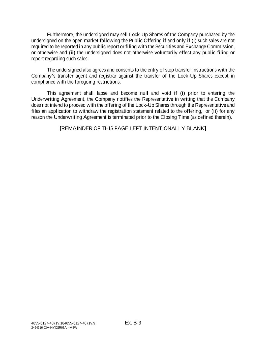 4855-6127-4071v.184855-6127-4071v.9 Ex. B-3 2464916.03A-NYCSR03A - MSW Furthermore, the undersigned may sell Lock-Up Shares of the Company purchased by the undersigned on the open market following the Public Offering if and only if (i) such sales are not required to be reported in any public report or filing with the Securities and Exchange Commission, or otherwise and (ii) the undersigned does not otherwise voluntarily effect any public filing or report regarding such sales. The undersigned also agrees and consents to the entry of stop transfer instructions with the Company’s transfer agent and registrar against the transfer of the Lock-Up Shares except in compliance with the foregoing restrictions. This agreement shall lapse and become null and void if (i) prior to entering the Underwriting Agreement, the Company notifies the Representative in writing that the Company does not intend to proceed with the offering of the Lock-Up Shares through the Representative and files an application to withdraw the registration statement related to the offering, or (ii) for any reason the Underwriting Agreement is terminated prior to the Closing Time (as defined therein). [REMAINDER OF THIS PAGE LEFT INTENTIONALLY BLANK]