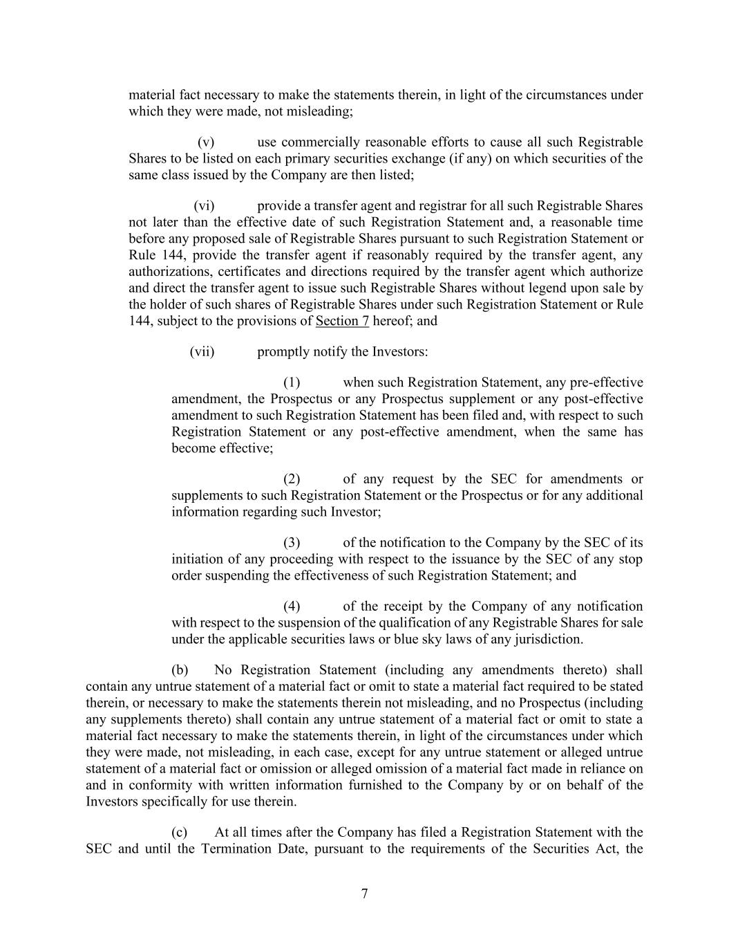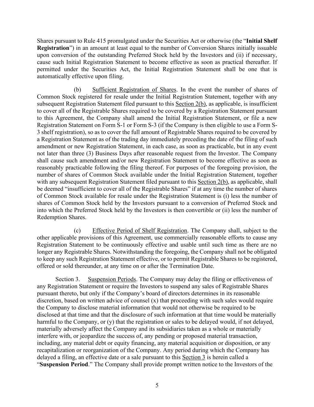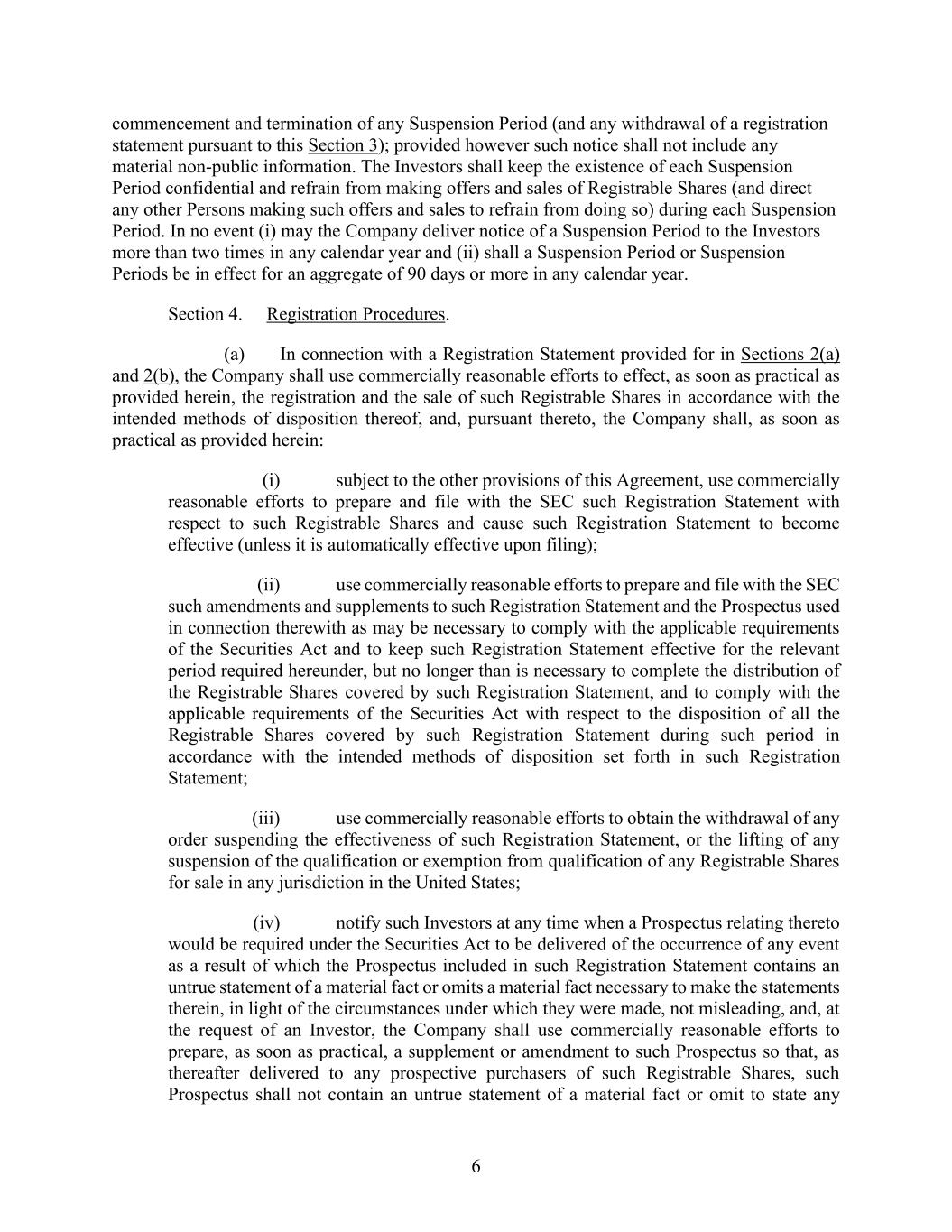 4855-6127-4071v.184855-6127-4071v.9 15 2464916.03A-NYCSR03A - MSW Payment shall be made to the Company by wire transfer of immediately available funds to the bank account designated by the Company against delivery to the Underwriters of the Shares to be purchased by the Underwriters. SECTION 3. Covenants of the Company. The Company covenants with the Underwriters as follows: (a) Compliance with Securities Regulations and Commission Requests. The Company, subject to Section 3(b), will comply with the requirements of Rule 430A, and will notify the Underwriters as soon as practicable (i) when any post-effective amendment to the Registration Statement shall become effective or any amendment or supplement to the Prospectus shall have been filed, (ii) of the receipt of any comments from the Commission, (iii) of any request by the Commission for any amendment to the Registration Statement or any amendment or supplement to the Time of Sale Prospectus or the Prospectus or for additional information, (iv) of the issuance by the Commission of any stop order suspending the effectiveness of the Registration Statement or any post-effective amendment or of any order preventing or suspending the use of any preliminary prospectus or the Prospectus, or of the suspension of the qualification of the Securities for offering or sale in any jurisdiction, or of the initiation or threatening of any proceedings for any of such purposes or of any examination pursuant to Section 8(d) or 8(e) of the Securities Act concerning the Registration Statement and (v) if the Company becomes the subject of a proceeding under Section 8A of the Securities Act in connection with the offering of the Shares . The Company will effect all filings required under Rule 424(b) in the manner and within the time period required by Rule 424(b) (without reliance on Rule 424(b)(8)). The Company will make every commercially reasonable effort to prevent the issuance of any stop order, prevention or suspension and, if any such order is issued, to obtain the lifting thereof as soon as practicable. (b) Continued Compliance with Securities Laws. The Company will comply with the Securities Act and the Securities Act Regulations so as to permit the completion of the distribution of the Shares as contemplated in this Agreement and in the Registration Statement, Time of Sale Prospectus and Prospectus. If at any time when a prospectus relating to the Shares is (or, but for the exception afforded by Rule 172 of the Securities Act Regulations (“Rule 172”), would be) required by the Securities Act to be delivered in connection with sales of the Securities, any event shall occur or condition shall exist as a result of which it is necessary, in the opinion of counsel for the Underwriters or for the Company, to (i) amend the Registration Statement in order that the Registration Statement will not include an untrue statement of a material fact or omit to state a material fact required to be stated therein or necessary to make the statements therein not misleading, (ii) amend or supplement the Time of Sale Prospectus or the Prospectus in order that the Time of Sale Prospectus or the Prospectus, as the case may be, will not contain any untrue statement of a material fact or omit to state a material fact necessary in order to make the statements therein not misleading in the light of the circumstances existing at the time it is delivered to a purchaser or (iii) amend the Registration Statement or amend or supplement the Time of Sale Prospectus or the Prospectus, as the case may be, in order to comply with the requirements of the Securities Act or the Securities Act Regulations, the Company will promptly (A) give the Underwriters notice of such event, (B) prepare any amendment or supplement as may be necessary to correct such statement or omission or to make the Registration Statement, the Time of Sale Prospectus or the Prospectus comply with such requirements and, a reasonable amount of time prior to any proposed filing or use, furnish the Underwriters with copies of any such amendment