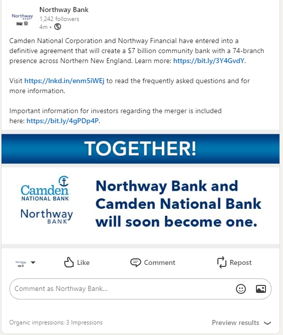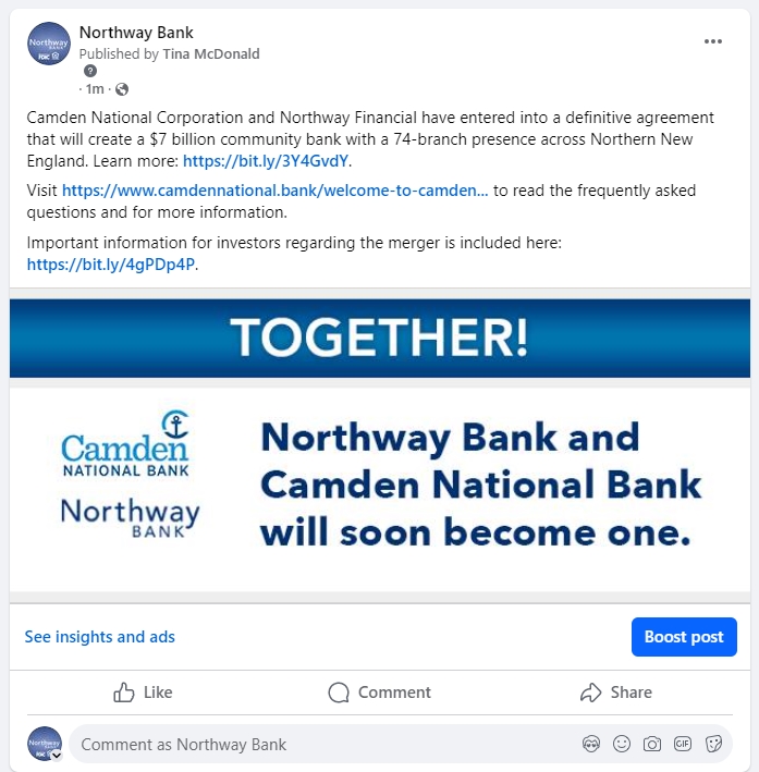 The following communications were made available by Northway Bank, in connection with the proposed transaction between Camden National Corporation (“Camden”) and Northway Financial, Inc. (“Northway”), on the social media platforms indicated below: