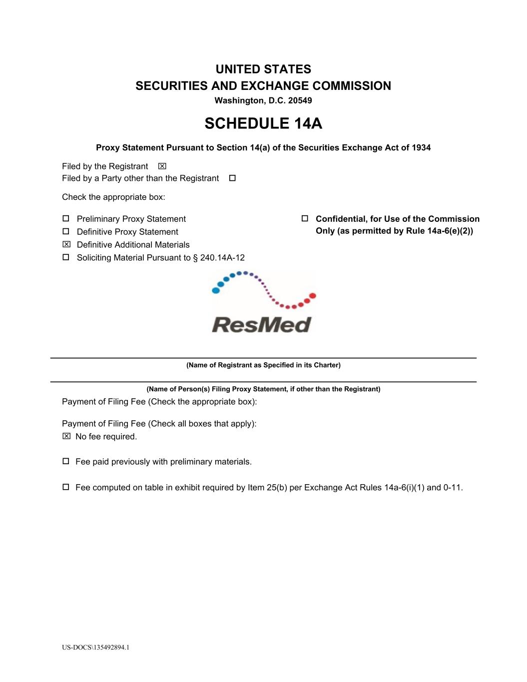 Your Vote Counts! Smartphone users Point your camera here and vote without entering a control number For complete information and to vote, visit www.ProxyVote.com Control # V57723-P18666 RESMED INC. 9001 SPECTRUM CENTER BLVD. SAN DIEGO, CA 92123 ATTN: AMY WAKEHAM RESMED INC. 2024 Annual Meeting Date: November 20, 2024 Time: 4:30 p.m. (US Pacific Time) November 21, 2024 Time: 8:30 a.m. (Singapore Time); 11:30 a.m. (Australian Eastern Time) Live webcast: Meeting live via the internet-please visit www.virtualshareholdermeeting.com/RMD2024 *Please check the meeting materials for any special requirements for meeting attendance. You invested in RESMED INC. and it’s time to vote! You have the right to vote on proposals being presented at the Annual Meeting. Important notice regarding the availability of proxy materials for the stockholder meeting to be held on November 20, 2024 (US Time)/ November 21, 2024 (Singapore and Australian Time). Get informed before you vote View the Notice, Proxy Statement, and Form 10-K online at www.ProxyVote.com, OR you can receive a free paper or email copy of the materials. If you would like to request a copy of the materials for this and/or future stockholder meetings, you may (1) visit http://www.ProxyVote.com, (2) call 1-800-579-1639, or (3) send an email to sendmaterial@ProxyVote.com, by November 6, 2024. If sending an email, please include your control number (indicated below) in the subject line. Unless requested, you will not otherwise receive a paper or email copy. Virtually at: www.virtualshareholdermeeting.com/RMD2024 Vote Virtually at the Meeting* November 20, 2024 at 4:30 p.m. (US Pacific Time) November 21, 2024 at 8:30 a.m. (Singapore Time); 11:30 a.m. (Australian Eastern Time)