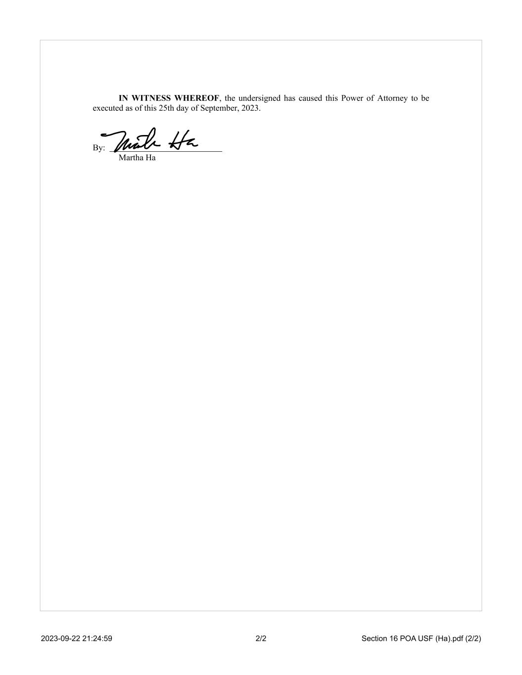 2/2 Section 16 POA USF (Ha).pdf (2/2)2023-09-22 21:24:59 IN WITNESS WHEREOF, the undersigned has caused this Power of Attorney to be executed as of this 25th day of September, 2023. By: Martha Ha