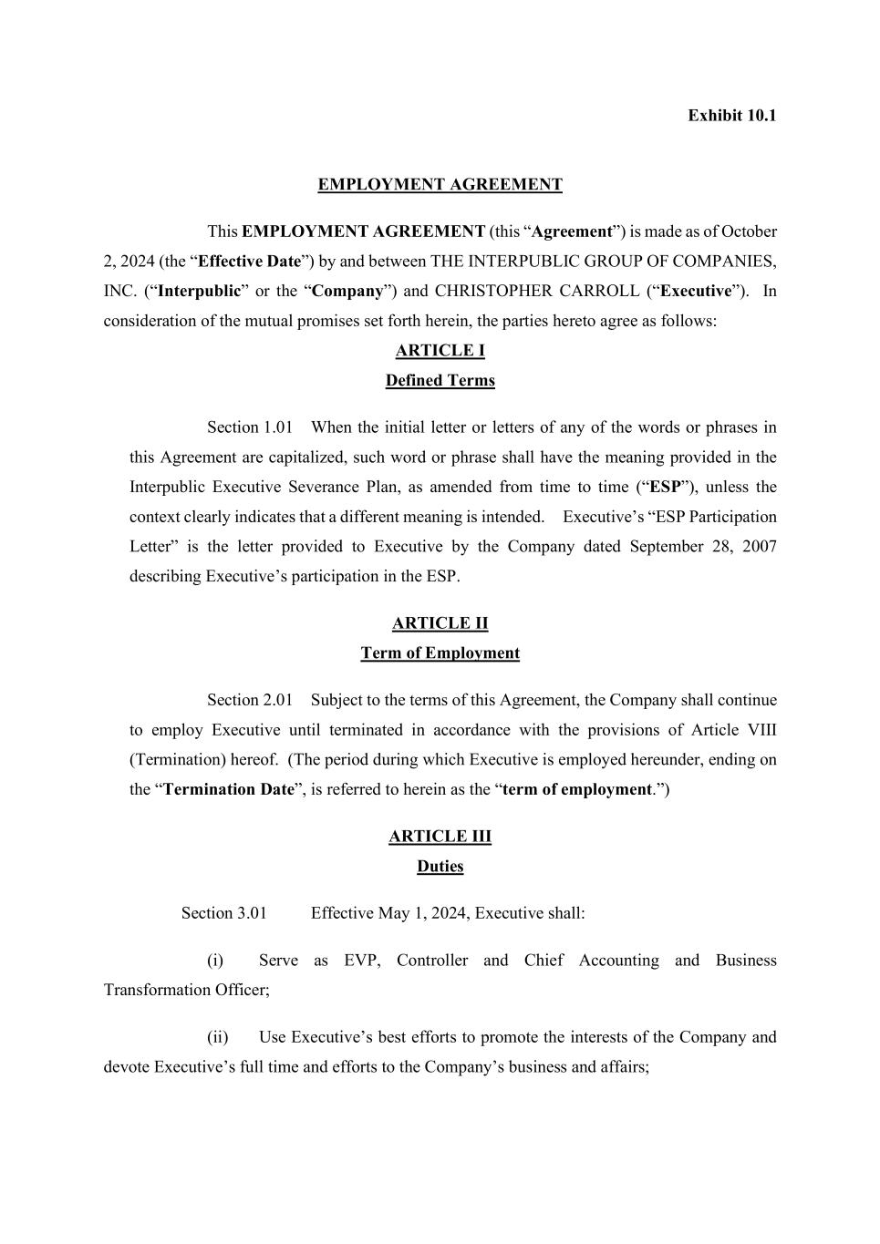 Exhibit 10.1 EMPLOYMENT AGREEMENT This EMPLOYMENT AGREEMENT (this “Agreement”) is made as of October 2, 2024 (the “Effective Date”) by and between THE INTERPUBLIC GROUP OF COMPANIES, INC. (“Interpublic” or the “Company”) and CHRISTOPHER CARROLL (“Executive”). In consideration of the mutual promises set forth herein, the parties hereto agree as follows: ARTICLE I Defined Terms Section 1.01 When the initial letter or letters of any of the words or phrases in this Agreement are capitalized, such word or phrase shall have the meaning provided in the Interpublic Executive Severance Plan, as amended from time to time (“ESP”), unless the context clearly indicates that a different meaning is intended. Executive’s “ESP Participation Letter” is the letter provided to Executive by the Company dated September 28, 2007 describing Executive’s participation in the ESP. ARTICLE II Term of Employment Section 2.01 Subject to the terms of this Agreement, the Company shall continue to employ Executive until terminated in accordance with the provisions of Article VIII (Termination) hereof. (The period during which Executive is employed hereunder, ending on the “Termination Date”, is referred to herein as the “term of employment.”) ARTICLE III Duties Section 3.01 Effective May 1, 2024, Executive shall: (i) Serve as EVP, Controller and Chief Accounting and Business Transformation Officer; (ii) Use Executive’s best efforts to promote the interests of the Company and devote Executive’s full time and efforts to the Company’s business and affairs;