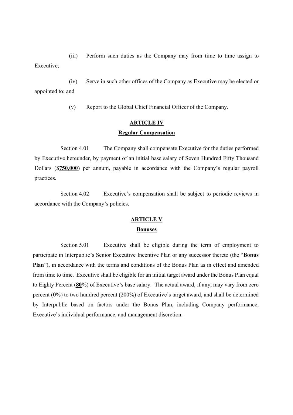 (iii) Perform such duties as the Company may from time to time assign to Executive; (iv) Serve in such other offices of the Company as Executive may be elected or appointed to; and (v) Report to the Global Chief Financial Officer of the Company. ARTICLE IV Regular Compensation Section 4.01 The Company shall compensate Executive for the duties performed by Executive hereunder, by payment of an initial base salary of Seven Hundred Fifty Thousand Dollars ($750,000) per annum, payable in accordance with the Company’s regular payroll practices. Section 4.02 Executive’s compensation shall be subject to periodic reviews in accordance with the Company’s policies. ARTICLE V Bonuses Section 5.01 Executive shall be eligible during the term of employment to participate in Interpublic’s Senior Executive Incentive Plan or any successor thereto (the “Bonus Plan”), in accordance with the terms and conditions of the Bonus Plan as in effect and amended from time to time. Executive shall be eligible for an initial target award under the Bonus Plan equal to Eighty Percent (80%) of Executive’s base salary. The actual award, if any, may vary from zero percent (0%) to two hundred percent (200%) of Executive’s target award, and shall be determined by Interpublic based on factors under the Bonus Plan, including Company performance, Executive’s individual performance, and management discretion.