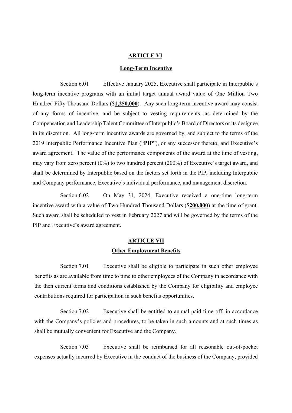 ARTICLE VI Long-Term Incentive Section 6.01 Effective January 2025, Executive shall participate in Interpublic’s long-term incentive programs with an initial target annual award value of One Million Two Hundred Fifty Thousand Dollars ($1,250,000). Any such long-term incentive award may consist of any forms of incentive, and be subject to vesting requirements, as determined by the Compensation and Leadership Talent Committee of Interpublic’s Board of Directors or its designee in its discretion. All long-term incentive awards are governed by, and subject to the terms of the 2019 Interpublic Performance Incentive Plan (“PIP”), or any successor thereto, and Executive’s award agreement. The value of the performance components of the award at the time of vesting, may vary from zero percent (0%) to two hundred percent (200%) of Executive’s target award, and shall be determined by Interpublic based on the factors set forth in the PIP, including Interpublic and Company performance, Executive’s individual performance, and management discretion. Section 6.02 On May 31, 2024, Executive received a one-time long-term incentive award with a value of Two Hundred Thousand Dollars ($200,000) at the time of grant. Such award shall be scheduled to vest in February 2027 and will be governed by the terms of the PIP and Executive’s award agreement. ARTICLE VII Other Employment Benefits Section 7.01 Executive shall be eligible to participate in such other employee benefits as are available from time to time to other employees of the Company in accordance with the then current terms and conditions established by the Company for eligibility and employee contributions required for participation in such benefits opportunities. Section 7.02 Executive shall be entitled to annual paid time off, in accordance with the Company’s policies and procedures, to be taken in such amounts and at such times as shall be mutually convenient for Executive and the Company. Section 7.03 Executive shall be reimbursed for all reasonable out-of-pocket expenses actually incurred by Executive in the conduct of the business of the Company, provided