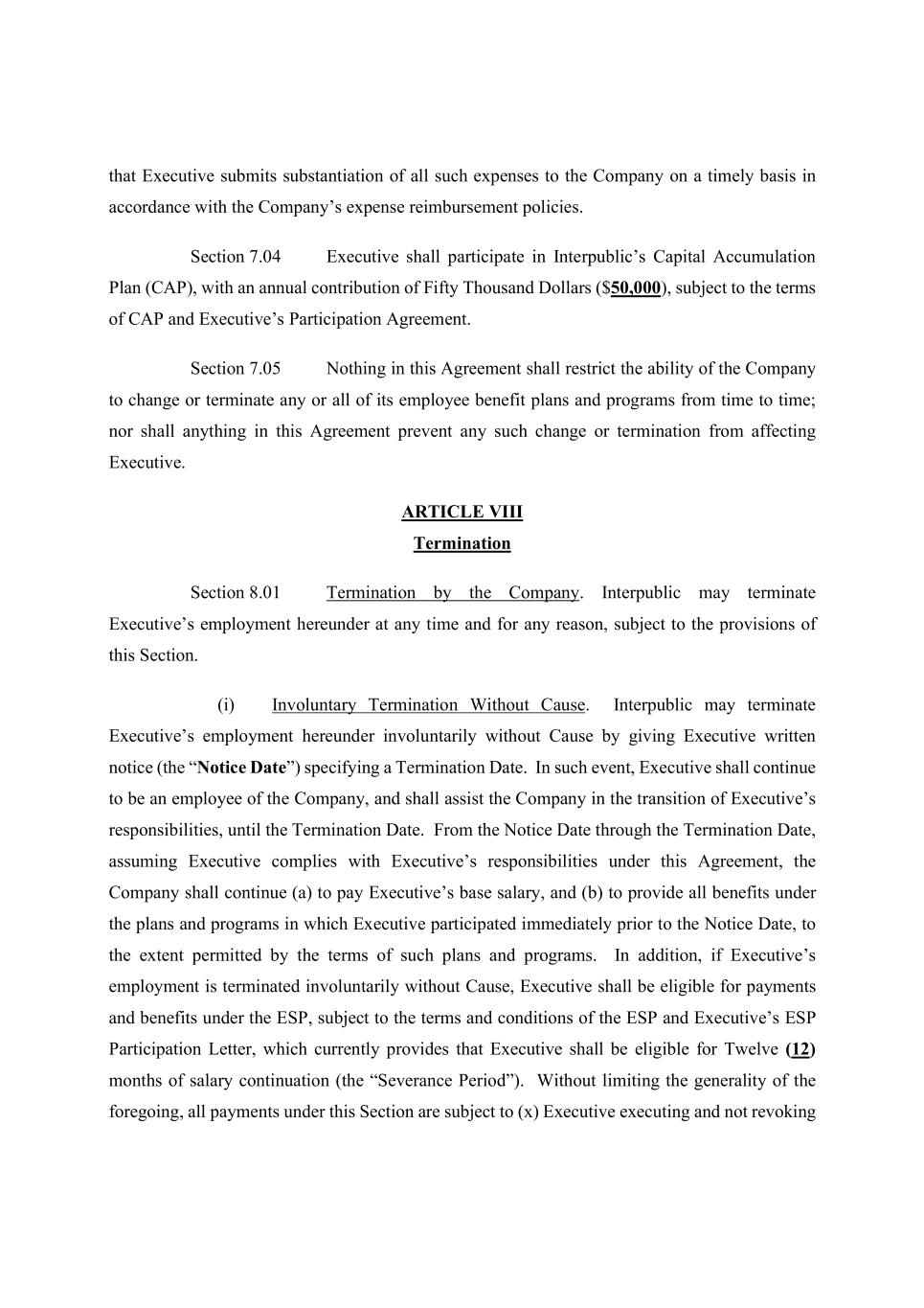 that Executive submits substantiation of all such expenses to the Company on a timely basis in accordance with the Company’s expense reimbursement policies. Section 7.04 Executive shall participate in Interpublic’s Capital Accumulation Plan (CAP), with an annual contribution of Fifty Thousand Dollars ($50,000), subject to the terms of CAP and Executive’s Participation Agreement. Section 7.05 Nothing in this Agreement shall restrict the ability of the Company to change or terminate any or all of its employee benefit plans and programs from time to time; nor shall anything in this Agreement prevent any such change or termination from affecting Executive. ARTICLE VIII Termination Section 8.01 Termination by the Company. Interpublic may terminate Executive’s employment hereunder at any time and for any reason, subject to the provisions of this Section. (i) Involuntary Termination Without Cause. Interpublic may terminate Executive’s employment hereunder involuntarily without Cause by giving Executive written notice (the “Notice Date”) specifying a Termination Date. In such event, Executive shall continue to be an employee of the Company, and shall assist the Company in the transition of Executive’s responsibilities, until the Termination Date. From the Notice Date through the Termination Date, assuming Executive complies with Executive’s responsibilities under this Agreement, the Company shall continue (a) to pay Executive’s base salary, and (b) to provide all benefits under the plans and programs in which Executive participated immediately prior to the Notice Date, to the extent permitted by the terms of such plans and programs. In addition, if Executive’s employment is terminated involuntarily without Cause, Executive shall be eligible for payments and benefits under the ESP, subject to the terms and conditions of the ESP and Executive’s ESP Participation Letter, which currently provides that Executive shall be eligible for Twelve (12) months of salary continuation (the “Severance Period”). Without limiting the generality of the foregoing, all payments under this Section are subject to (x) Executive executing and not revoking