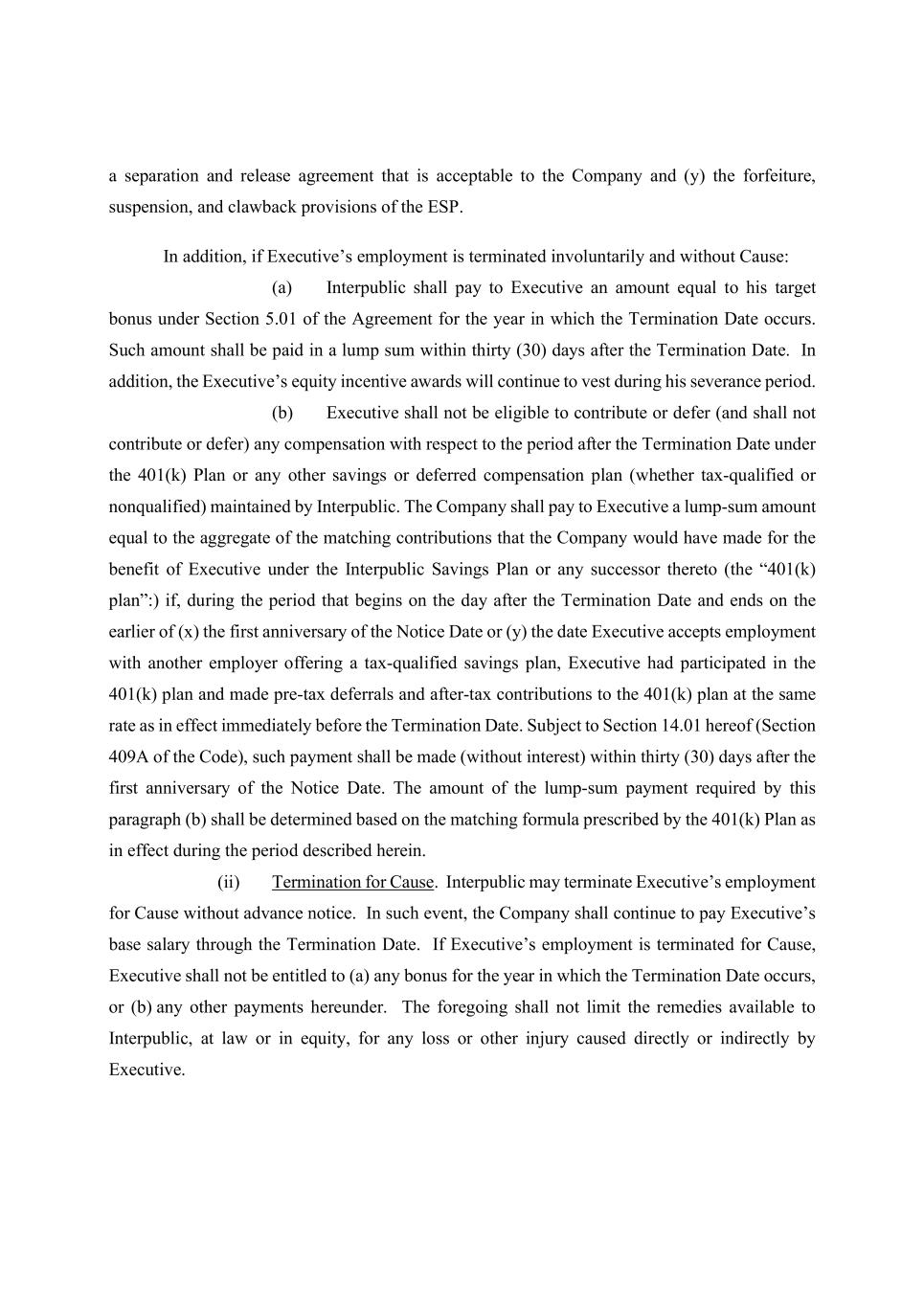 a separation and release agreement that is acceptable to the Company and (y) the forfeiture, suspension, and clawback provisions of the ESP. In addition, if Executive’s employment is terminated involuntarily and without Cause: (a) Interpublic shall pay to Executive an amount equal to his target bonus under Section 5.01 of the Agreement for the year in which the Termination Date occurs. Such amount shall be paid in a lump sum within thirty (30) days after the Termination Date. In addition, the Executive’s equity incentive awards will continue to vest during his severance period. (b) Executive shall not be eligible to contribute or defer (and shall not contribute or defer) any compensation with respect to the period after the Termination Date under the 401(k) Plan or any other savings or deferred compensation plan (whether tax-qualified or nonqualified) maintained by Interpublic. The Company shall pay to Executive a lump-sum amount equal to the aggregate of the matching contributions that the Company would have made for the benefit of Executive under the Interpublic Savings Plan or any successor thereto (the “401(k) plan”:) if, during the period that begins on the day after the Termination Date and ends on the earlier of (x) the first anniversary of the Notice Date or (y) the date Executive accepts employment with another employer offering a tax-qualified savings plan, Executive had participated in the 401(k) plan and made pre-tax deferrals and after-tax contributions to the 401(k) plan at the same rate as in effect immediately before the Termination Date. Subject to Section 14.01 hereof (Section 409A of the Code), such payment shall be made (without interest) within thirty (30) days after the first anniversary of the Notice Date. The amount of the lump-sum payment required by this paragraph (b) shall be determined based on the matching formula prescribed by the 401(k) Plan as in effect during the period described herein. (ii) Termination for Cause. Interpublic may terminate Executive’s employment for Cause without advance notice. In such event, the Company shall continue to pay Executive’s base salary through the Termination Date. If Executive’s employment is terminated for Cause, Executive shall not be entitled to (a) any bonus for the year in which the Termination Date occurs, or (b) any other payments hereunder. The foregoing shall not limit the remedies available to Interpublic, at law or in equity, for any loss or other injury caused directly or indirectly by Executive.