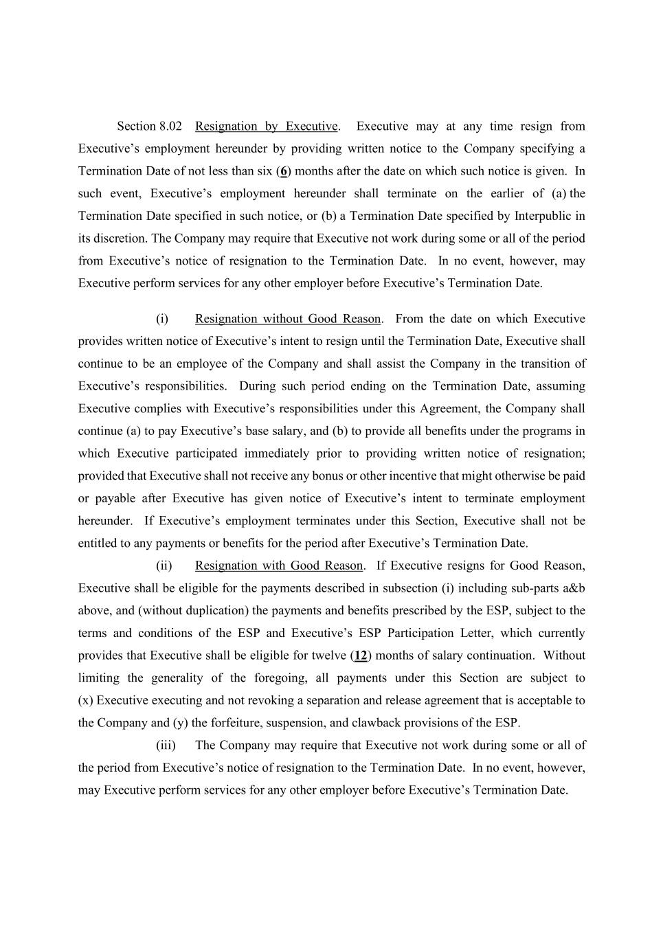 Section 8.02 Resignation by Executive. Executive may at any time resign from Executive’s employment hereunder by providing written notice to the Company specifying a Termination Date of not less than six (6) months after the date on which such notice is given. In such event, Executive’s employment hereunder shall terminate on the earlier of (a) the Termination Date specified in such notice, or (b) a Termination Date specified by Interpublic in its discretion. The Company may require that Executive not work during some or all of the period from Executive’s notice of resignation to the Termination Date. In no event, however, may Executive perform services for any other employer before Executive’s Termination Date. (i) Resignation without Good Reason. From the date on which Executive provides written notice of Executive’s intent to resign until the Termination Date, Executive shall continue to be an employee of the Company and shall assist the Company in the transition of Executive’s responsibilities. During such period ending on the Termination Date, assuming Executive complies with Executive’s responsibilities under this Agreement, the Company shall continue (a) to pay Executive’s base salary, and (b) to provide all benefits under the programs in which Executive participated immediately prior to providing written notice of resignation; provided that Executive shall not receive any bonus or other incentive that might otherwise be paid or payable after Executive has given notice of Executive’s intent to terminate employment hereunder. If Executive’s employment terminates under this Section, Executive shall not be entitled to any payments or benefits for the period after Executive’s Termination Date. (ii) Resignation with Good Reason. If Executive resigns for Good Reason, Executive shall be eligible for the payments described in subsection (i) including sub-parts a&b above, and (without duplication) the payments and benefits prescribed by the ESP, subject to the terms and conditions of the ESP and Executive’s ESP Participation Letter, which currently provides that Executive shall be eligible for twelve (12) months of salary continuation. Without limiting the generality of the foregoing, all payments under this Section are subject to (x) Executive executing and not revoking a separation and release agreement that is acceptable to the Company and (y) the forfeiture, suspension, and clawback provisions of the ESP. (iii) The Company may require that Executive not work during some or all of the period from Executive’s notice of resignation to the Termination Date. In no event, however, may Executive perform services for any other employer before Executive’s Termination Date.