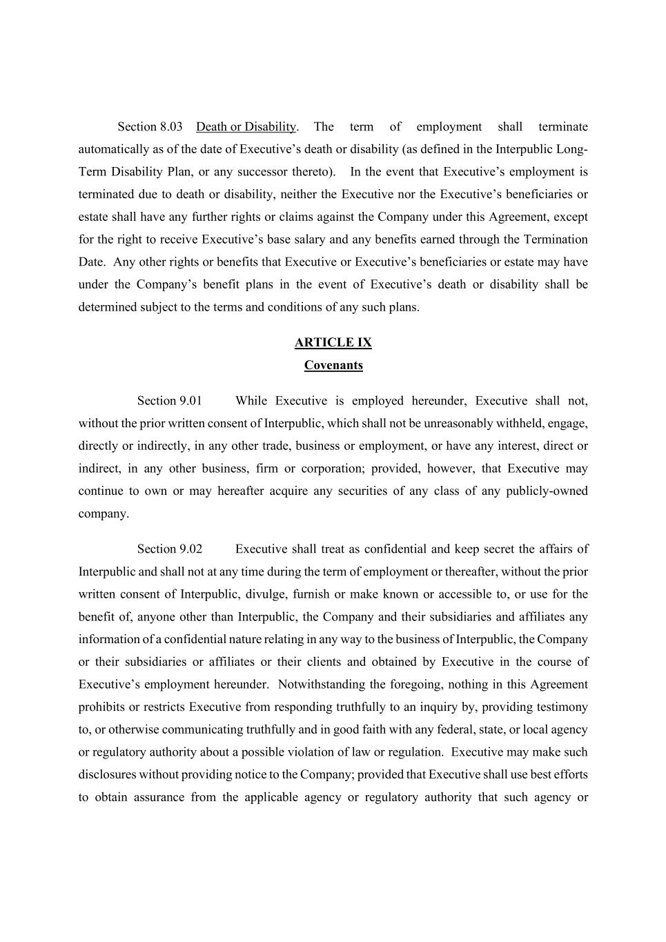 Section 8.03 Death or Disability. The term of employment shall terminate automatically as of the date of Executive’s death or disability (as defined in the Interpublic Long- Term Disability Plan, or any successor thereto). In the event that Executive’s employment is terminated due to death or disability, neither the Executive nor the Executive’s beneficiaries or estate shall have any further rights or claims against the Company under this Agreement, except for the right to receive Executive’s base salary and any benefits earned through the Termination Date. Any other rights or benefits that Executive or Executive’s beneficiaries or estate may have under the Company’s benefit plans in the event of Executive’s death or disability shall be determined subject to the terms and conditions of any such plans. ARTICLE IX Covenants Section 9.01 While Executive is employed hereunder, Executive shall not, without the prior written consent of Interpublic, which shall not be unreasonably withheld, engage, directly or indirectly, in any other trade, business or employment, or have any interest, direct or indirect, in any other business, firm or corporation; provided, however, that Executive may continue to own or may hereafter acquire any securities of any class of any publicly-owned company. Section 9.02 Executive shall treat as confidential and keep secret the affairs of Interpublic and shall not at any time during the term of employment or thereafter, without the prior written consent of Interpublic, divulge, furnish or make known or accessible to, or use for the benefit of, anyone other than Interpublic, the Company and their subsidiaries and affiliates any information of a confidential nature relating in any way to the business of Interpublic, the Company or their subsidiaries or affiliates or their clients and obtained by Executive in the course of Executive’s employment hereunder. Notwithstanding the foregoing, nothing in this Agreement prohibits or restricts Executive from responding truthfully to an inquiry by, providing testimony to, or otherwise communicating truthfully and in good faith with any federal, state, or local agency or regulatory authority about a possible violation of law or regulation. Executive may make such disclosures without providing notice to the Company; provided that Executive shall use best efforts to obtain assurance from the applicable agency or regulatory authority that such agency or