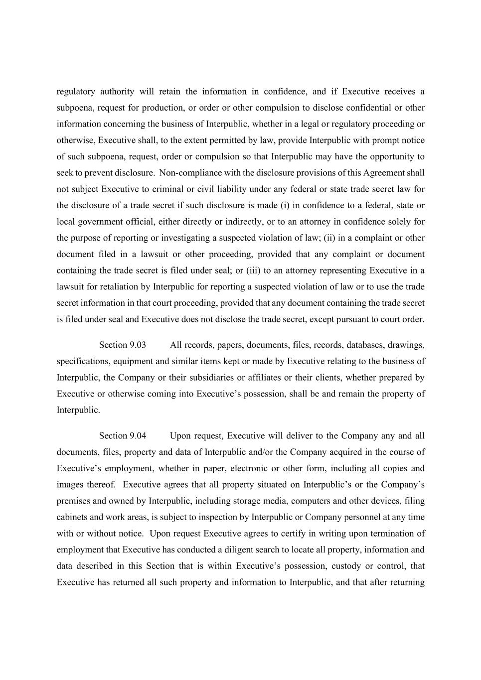 regulatory authority will retain the information in confidence, and if Executive receives a subpoena, request for production, or order or other compulsion to disclose confidential or other information concerning the business of Interpublic, whether in a legal or regulatory proceeding or otherwise, Executive shall, to the extent permitted by law, provide Interpublic with prompt notice of such subpoena, request, order or compulsion so that Interpublic may have the opportunity to seek to prevent disclosure. Non-compliance with the disclosure provisions of this Agreement shall not subject Executive to criminal or civil liability under any federal or state trade secret law for the disclosure of a trade secret if such disclosure is made (i) in confidence to a federal, state or local government official, either directly or indirectly, or to an attorney in confidence solely for the purpose of reporting or investigating a suspected violation of law; (ii) in a complaint or other document filed in a lawsuit or other proceeding, provided that any complaint or document containing the trade secret is filed under seal; or (iii) to an attorney representing Executive in a lawsuit for retaliation by Interpublic for reporting a suspected violation of law or to use the trade secret information in that court proceeding, provided that any document containing the trade secret is filed under seal and Executive does not disclose the trade secret, except pursuant to court order. Section 9.03 All records, papers, documents, files, records, databases, drawings, specifications, equipment and similar items kept or made by Executive relating to the business of Interpublic, the Company or their subsidiaries or affiliates or their clients, whether prepared by Executive or otherwise coming into Executive’s possession, shall be and remain the property of Interpublic. Section 9.04 Upon request, Executive will deliver to the Company any and all documents, files, property and data of Interpublic and/or the Company acquired in the course of Executive’s employment, whether in paper, electronic or other form, including all copies and images thereof. Executive agrees that all property situated on Interpublic’s or the Company’s premises and owned by Interpublic, including storage media, computers and other devices, filing cabinets and work areas, is subject to inspection by Interpublic or Company personnel at any time with or without notice. Upon request Executive agrees to certify in writing upon termination of employment that Executive has conducted a diligent search to locate all property, information and data described in this Section that is within Executive’s possession, custody or control, that Executive has returned all such property and information to Interpublic, and that after returning