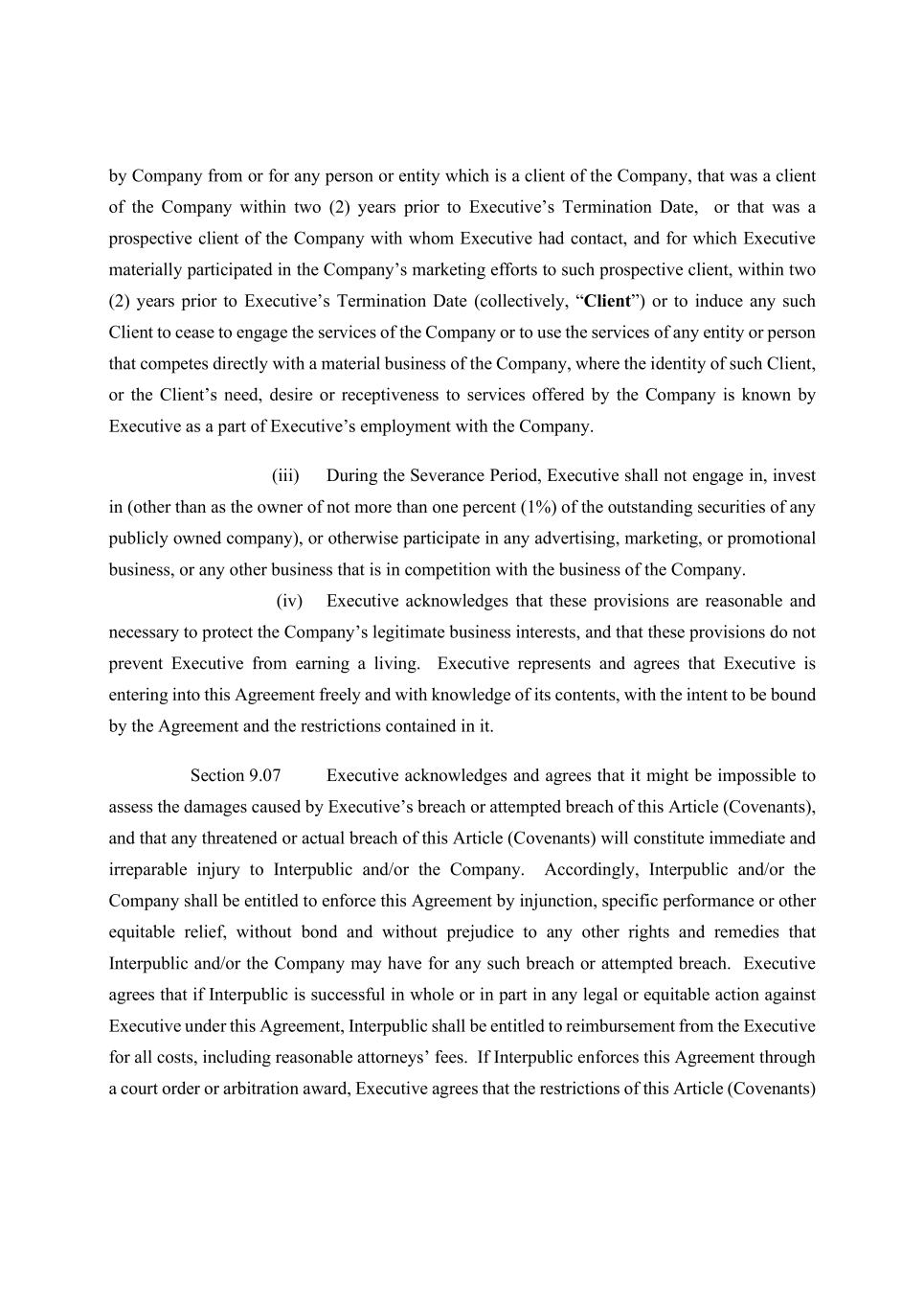 by Company from or for any person or entity which is a client of the Company, that was a client of the Company within two (2) years prior to Executive’s Termination Date, or that was a prospective client of the Company with whom Executive had contact, and for which Executive materially participated in the Company’s marketing efforts to such prospective client, within two (2) years prior to Executive’s Termination Date (collectively, “Client”) or to induce any such Client to cease to engage the services of the Company or to use the services of any entity or person that competes directly with a material business of the Company, where the identity of such Client, or the Client’s need, desire or receptiveness to services offered by the Company is known by Executive as a part of Executive’s employment with the Company. (iii) During the Severance Period, Executive shall not engage in, invest in (other than as the owner of not more than one percent (1%) of the outstanding securities of any publicly owned company), or otherwise participate in any advertising, marketing, or promotional business, or any other business that is in competition with the business of the Company. (iv) Executive acknowledges that these provisions are reasonable and necessary to protect the Company’s legitimate business interests, and that these provisions do not prevent Executive from earning a living. Executive represents and agrees that Executive is entering into this Agreement freely and with knowledge of its contents, with the intent to be bound by the Agreement and the restrictions contained in it. Section 9.07 Executive acknowledges and agrees that it might be impossible to assess the damages caused by Executive’s breach or attempted breach of this Article (Covenants), and that any threatened or actual breach of this Article (Covenants) will constitute immediate and irreparable injury to Interpublic and/or the Company. Accordingly, Interpublic and/or the Company shall be entitled to enforce this Agreement by injunction, specific performance or other equitable relief, without bond and without prejudice to any other rights and remedies that Interpublic and/or the Company may have for any such breach or attempted breach. Executive agrees that if Interpublic is successful in whole or in part in any legal or equitable action against Executive under this Agreement, Interpublic shall be entitled to reimbursement from the Executive for all costs, including reasonable attorneys’ fees. If Interpublic enforces this Agreement through a court order or arbitration award, Executive agrees that the restrictions of this Article (Covenants)