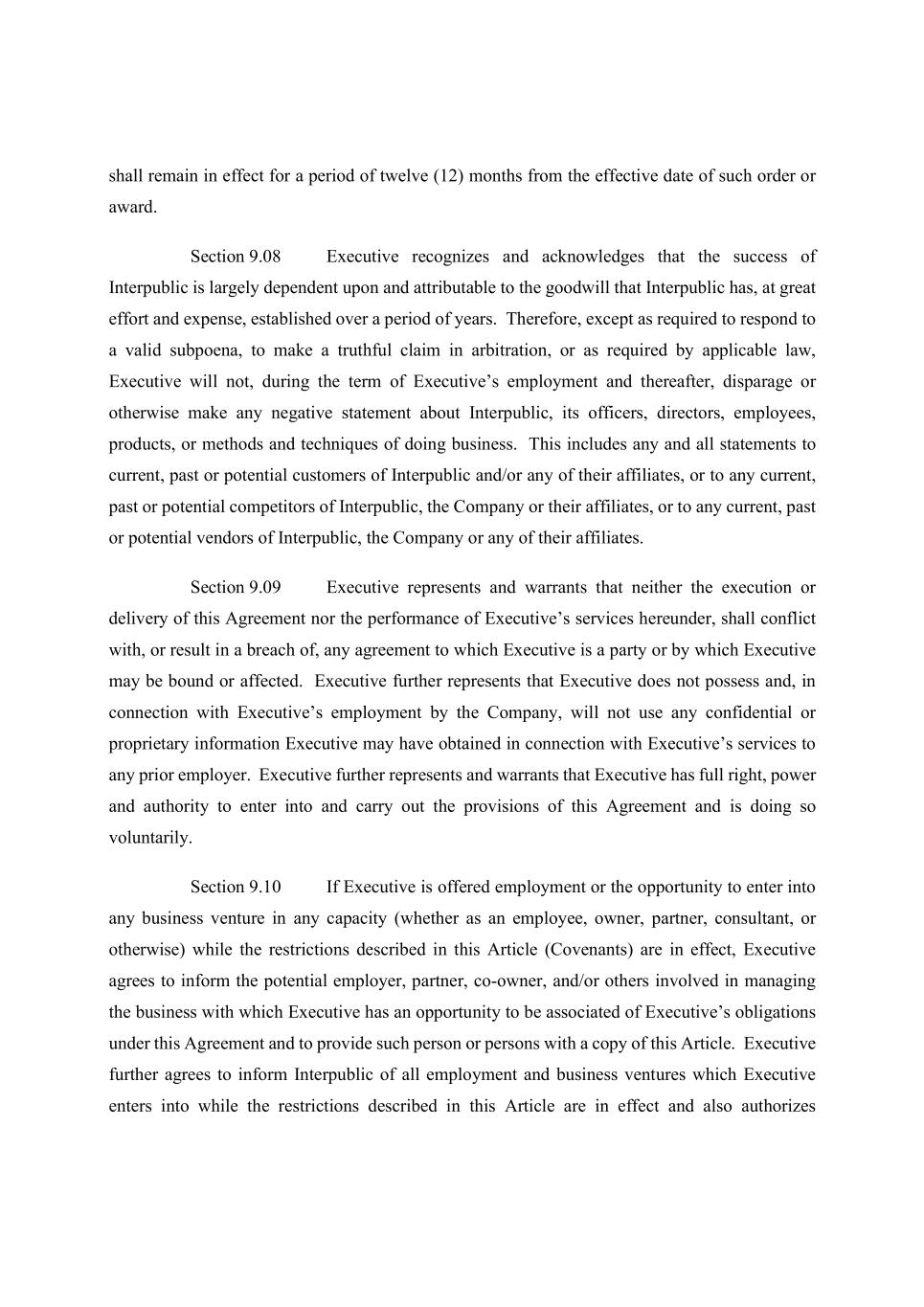 shall remain in effect for a period of twelve (12) months from the effective date of such order or award. Section 9.08 Executive recognizes and acknowledges that the success of Interpublic is largely dependent upon and attributable to the goodwill that Interpublic has, at great effort and expense, established over a period of years. Therefore, except as required to respond to a valid subpoena, to make a truthful claim in arbitration, or as required by applicable law, Executive will not, during the term of Executive’s employment and thereafter, disparage or otherwise make any negative statement about Interpublic, its officers, directors, employees, products, or methods and techniques of doing business. This includes any and all statements to current, past or potential customers of Interpublic and/or any of their affiliates, or to any current, past or potential competitors of Interpublic, the Company or their affiliates, or to any current, past or potential vendors of Interpublic, the Company or any of their affiliates. Section 9.09 Executive represents and warrants that neither the execution or delivery of this Agreement nor the performance of Executive’s services hereunder, shall conflict with, or result in a breach of, any agreement to which Executive is a party or by which Executive may be bound or affected. Executive further represents that Executive does not possess and, in connection with Executive’s employment by the Company, will not use any confidential or proprietary information Executive may have obtained in connection with Executive’s services to any prior employer. Executive further represents and warrants that Executive has full right, power and authority to enter into and carry out the provisions of this Agreement and is doing so voluntarily. Section 9.10 If Executive is offered employment or the opportunity to enter into any business venture in any capacity (whether as an employee, owner, partner, consultant, or otherwise) while the restrictions described in this Article (Covenants) are in effect, Executive agrees to inform the potential employer, partner, co-owner, and/or others involved in managing the business with which Executive has an opportunity to be associated of Executive’s obligations under this Agreement and to provide such person or persons with a copy of this Article. Executive further agrees to inform Interpublic of all employment and business ventures which Executive enters into while the restrictions described in this Article are in effect and also authorizes