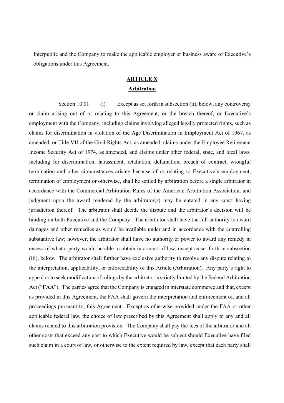 Interpublic and the Company to make the applicable employer or business aware of Executive’s obligations under this Agreement. ARTICLE X Arbitration Section 10.01 (i) Except as set forth in subsection (ii), below, any controversy or claim arising out of or relating to this Agreement, or the breach thereof, or Executive’s employment with the Company, including claims involving alleged legally protected rights, such as claims for discrimination in violation of the Age Discrimination in Employment Act of 1967, as amended, or Title VII of the Civil Rights Act, as amended, claims under the Employee Retirement Income Security Act of 1974, as amended, and claims under other federal, state, and local laws, including for discrimination, harassment, retaliation, defamation, breach of contract, wrongful termination and other circumstances arising because of or relating to Executive’s employment, termination of employment or otherwise, shall be settled by arbitration before a single arbitrator in accordance with the Commercial Arbitration Rules of the American Arbitration Association, and judgment upon the award rendered by the arbitrator(s) may be entered in any court having jurisdiction thereof. The arbitrator shall decide the dispute and the arbitrator’s decision will be binding on both Executive and the Company. The arbitrator shall have the full authority to award damages and other remedies as would be available under and in accordance with the controlling substantive law; however, the arbitrator shall have no authority or power to award any remedy in excess of what a party would be able to obtain in a court of law, except as set forth in subsection (iii), below. The arbitrator shall further have exclusive authority to resolve any dispute relating to the interpretation, applicability, or enforceability of this Article (Arbitration). Any party’s right to appeal or to seek modification of rulings by the arbitrator is strictly limited by the Federal Arbitration Act (“FAA”). The parties agree that the Company is engaged in interstate commerce and that, except as provided in this Agreement, the FAA shall govern the interpretation and enforcement of, and all proceedings pursuant to, this Agreement. Except as otherwise provided under the FAA or other applicable federal law, the choice of law prescribed by this Agreement shall apply to any and all claims related to this arbitration provision. The Company shall pay the fees of the arbitrator and all other costs that exceed any cost to which Executive would be subject should Executive have filed such claim in a court of law, or otherwise to the extent required by law, except that each party shall