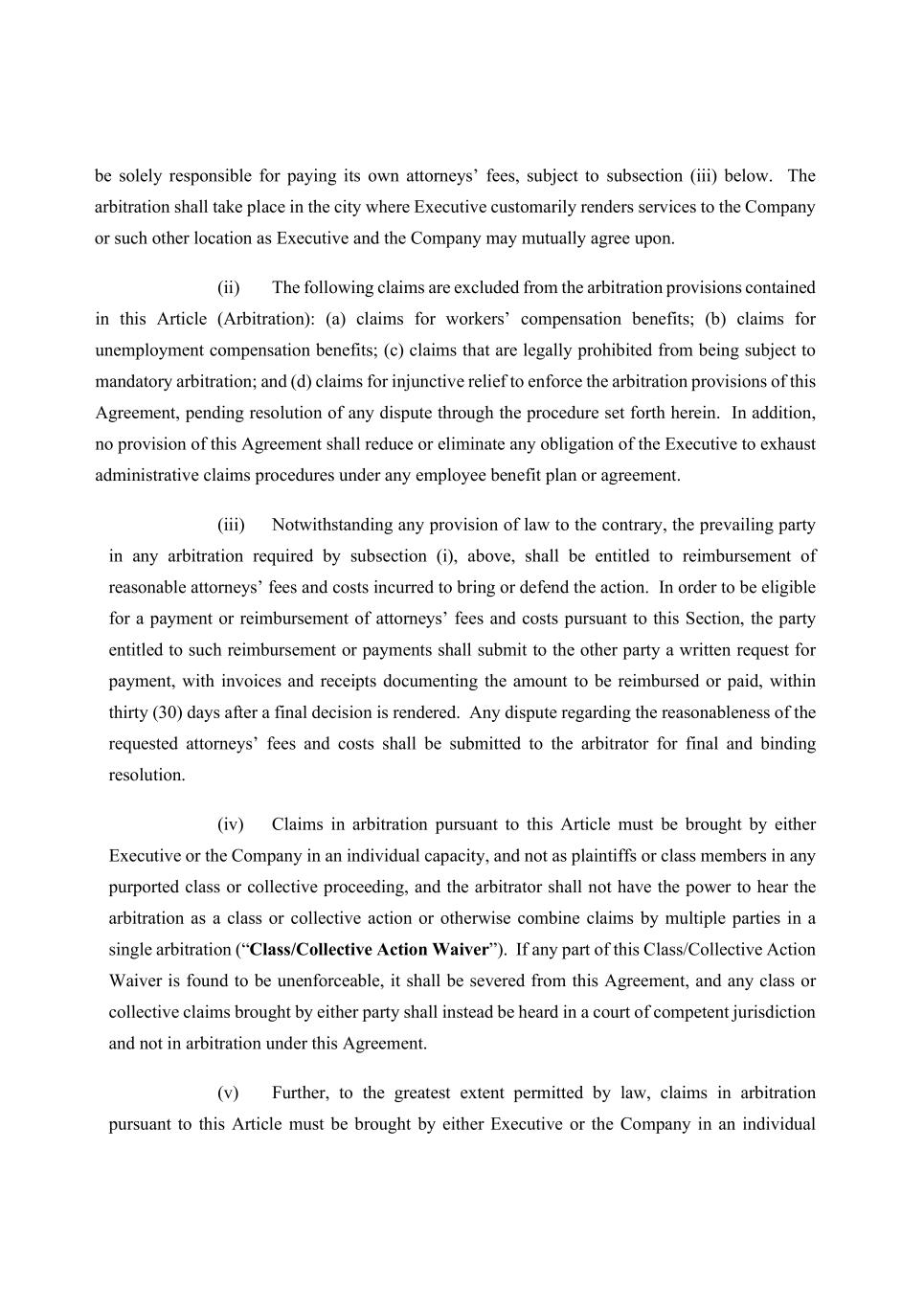 be solely responsible for paying its own attorneys’ fees, subject to subsection (iii) below. The arbitration shall take place in the city where Executive customarily renders services to the Company or such other location as Executive and the Company may mutually agree upon. (ii) The following claims are excluded from the arbitration provisions contained in this Article (Arbitration): (a) claims for workers’ compensation benefits; (b) claims for unemployment compensation benefits; (c) claims that are legally prohibited from being subject to mandatory arbitration; and (d) claims for injunctive relief to enforce the arbitration provisions of this Agreement, pending resolution of any dispute through the procedure set forth herein. In addition, no provision of this Agreement shall reduce or eliminate any obligation of the Executive to exhaust administrative claims procedures under any employee benefit plan or agreement. (iii) Notwithstanding any provision of law to the contrary, the prevailing party in any arbitration required by subsection (i), above, shall be entitled to reimbursement of reasonable attorneys’ fees and costs incurred to bring or defend the action. In order to be eligible for a payment or reimbursement of attorneys’ fees and costs pursuant to this Section, the party entitled to such reimbursement or payments shall submit to the other party a written request for payment, with invoices and receipts documenting the amount to be reimbursed or paid, within thirty (30) days after a final decision is rendered. Any dispute regarding the reasonableness of the requested attorneys’ fees and costs shall be submitted to the arbitrator for final and binding resolution. (iv) Claims in arbitration pursuant to this Article must be brought by either Executive or the Company in an individual capacity, and not as plaintiffs or class members in any purported class or collective proceeding, and the arbitrator shall not have the power to hear the arbitration as a class or collective action or otherwise combine claims by multiple parties in a single arbitration (“Class/Collective Action Waiver”). If any part of this Class/Collective Action Waiver is found to be unenforceable, it shall be severed from this Agreement, and any class or collective claims brought by either party shall instead be heard in a court of competent jurisdiction and not in arbitration under this Agreement. (v) Further, to the greatest extent permitted by law, claims in arbitration pursuant to this Article must be brought by either Executive or the Company in an individual
