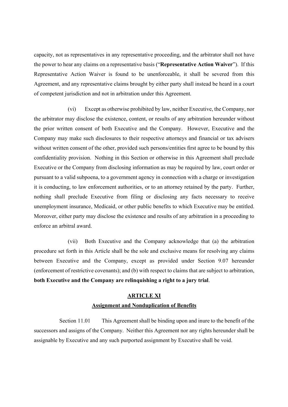 capacity, not as representatives in any representative proceeding, and the arbitrator shall not have the power to hear any claims on a representative basis (“Representative Action Waiver”). If this Representative Action Waiver is found to be unenforceable, it shall be severed from this Agreement, and any representative claims brought by either party shall instead be heard in a court of competent jurisdiction and not in arbitration under this Agreement. (vi) Except as otherwise prohibited by law, neither Executive, the Company, nor the arbitrator may disclose the existence, content, or results of any arbitration hereunder without the prior written consent of both Executive and the Company. However, Executive and the Company may make such disclosures to their respective attorneys and financial or tax advisers without written consent of the other, provided such persons/entities first agree to be bound by this confidentiality provision. Nothing in this Section or otherwise in this Agreement shall preclude Executive or the Company from disclosing information as may be required by law, court order or pursuant to a valid subpoena, to a government agency in connection with a charge or investigation it is conducting, to law enforcement authorities, or to an attorney retained by the party. Further, nothing shall preclude Executive from filing or disclosing any facts necessary to receive unemployment insurance, Medicaid, or other public benefits to which Executive may be entitled. Moreover, either party may disclose the existence and results of any arbitration in a proceeding to enforce an arbitral award. (vii) Both Executive and the Company acknowledge that (a) the arbitration procedure set forth in this Article shall be the sole and exclusive means for resolving any claims between Executive and the Company, except as provided under Section 9.07 hereunder (enforcement of restrictive covenants); and (b) with respect to claims that are subject to arbitration, both Executive and the Company are relinquishing a right to a jury trial. ARTICLE XI Assignment and Nonduplication of Benefits Section 11.01 This Agreement shall be binding upon and inure to the benefit of the successors and assigns of the Company. Neither this Agreement nor any rights hereunder shall be assignable by Executive and any such purported assignment by Executive shall be void.