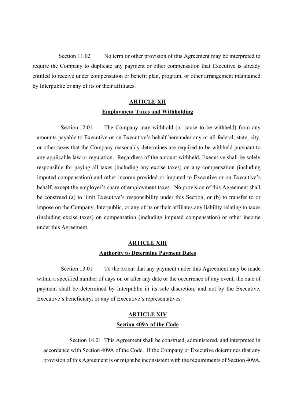 Section 11.02 No term or other provision of this Agreement may be interpreted to require the Company to duplicate any payment or other compensation that Executive is already entitled to receive under compensation or benefit plan, program, or other arrangement maintained by Interpublic or any of its or their affiliates. ARTICLE XII Employment Taxes and Withholding Section 12.01 The Company may withhold (or cause to be withheld) from any amounts payable to Executive or on Executive’s behalf hereunder any or all federal, state, city, or other taxes that the Company reasonably determines are required to be withheld pursuant to any applicable law or regulation. Regardless of the amount withheld, Executive shall be solely responsible for paying all taxes (including any excise taxes) on any compensation (including imputed compensation) and other income provided or imputed to Executive or on Executive’s behalf, except the employer’s share of employment taxes. No provision of this Agreement shall be construed (a) to limit Executive’s responsibility under this Section, or (b) to transfer to or impose on the Company, Interpublic, or any of its or their affiliates any liability relating to taxes (including excise taxes) on compensation (including imputed compensation) or other income under this Agreement. ARTICLE XIII Authority to Determine Payment Dates Section 13.01 To the extent that any payment under this Agreement may be made within a specified number of days on or after any date or the occurrence of any event, the date of payment shall be determined by Interpublic in its sole discretion, and not by the Executive, Executive’s beneficiary, or any of Executive’s representatives. ARTICLE XIV Section 409A of the Code Section 14.01 This Agreement shall be construed, administered, and interpreted in accordance with Section 409A of the Code. If the Company or Executive determines that any provision of this Agreement is or might be inconsistent with the requirements of Section 409A,