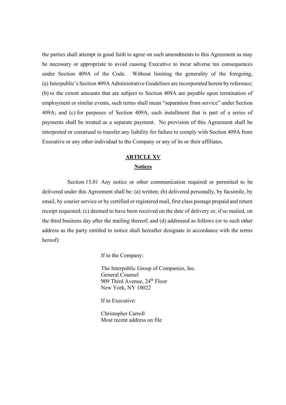 the parties shall attempt in good faith to agree on such amendments to this Agreement as may be necessary or appropriate to avoid causing Executive to incur adverse tax consequences under Section 409A of the Code. Without limiting the generality of the foregoing, (a) Interpublic’s Section 409A Administrative Guidelines are incorporated herein by reference; (b) to the extent amounts that are subject to Section 409A are payable upon termination of employment or similar events, such terms shall mean “separation from service” under Section 409A; and (c) for purposes of Section 409A, each installment that is part of a series of payments shall be treated as a separate payment. No provision of this Agreement shall be interpreted or construed to transfer any liability for failure to comply with Section 409A from Executive or any other individual to the Company or any of its or their affiliates. ARTICLE XV Notices Section 15.01 Any notice or other communication required or permitted to be delivered under this Agreement shall be: (a) written; (b) delivered personally, by facsimile, by email, by courier service or by certified or registered mail, first class postage prepaid and return receipt requested; (c) deemed to have been received on the date of delivery or, if so mailed, on the third business day after the mailing thereof; and (d) addressed as follows (or to such other address as the party entitled to notice shall hereafter designate in accordance with the terms hereof): If to the Company: The Interpublic Group of Companies, Inc. General Counsel 909 Third Avenue, 24th Floor New York, NY 10022 If to Executive: Christopher Carroll Most recent address on file