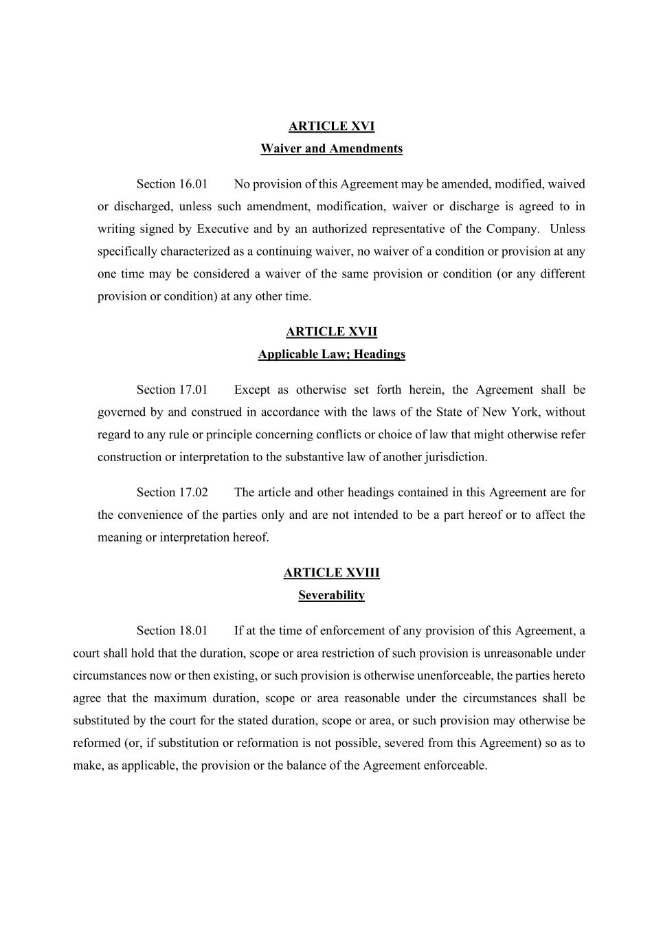 ARTICLE XVI Waiver and Amendments Section 16.01 No provision of this Agreement may be amended, modified, waived or discharged, unless such amendment, modification, waiver or discharge is agreed to in writing signed by Executive and by an authorized representative of the Company. Unless specifically characterized as a continuing waiver, no waiver of a condition or provision at any one time may be considered a waiver of the same provision or condition (or any different provision or condition) at any other time. ARTICLE XVII Applicable Law; Headings Section 17.01 Except as otherwise set forth herein, the Agreement shall be governed by and construed in accordance with the laws of the State of New York, without regard to any rule or principle concerning conflicts or choice of law that might otherwise refer construction or interpretation to the substantive law of another jurisdiction. Section 17.02 The article and other headings contained in this Agreement are for the convenience of the parties only and are not intended to be a part hereof or to affect the meaning or interpretation hereof. ARTICLE XVIII Severability Section 18.01 If at the time of enforcement of any provision of this Agreement, a court shall hold that the duration, scope or area restriction of such provision is unreasonable under circumstances now or then existing, or such provision is otherwise unenforceable, the parties hereto agree that the maximum duration, scope or area reasonable under the circumstances shall be substituted by the court for the stated duration, scope or area, or such provision may otherwise be reformed (or, if substitution or reformation is not possible, severed from this Agreement) so as to make, as applicable, the provision or the balance of the Agreement enforceable.