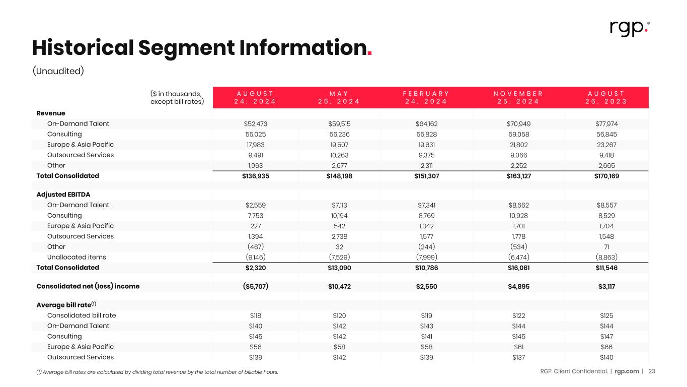 RGP. Client Confidential. | rgp.com | 23 (Unaudited) Historical Segment Information. A U G U S T 2 4 , 2 0 2 4 M A Y 2 5 , 2 0 2 4 F E B R U A R Y 2 4 , 2 0 2 4 N O V E M B E R 2 5 , 2 0 2 4 A U G U S T 2 6 , 2 0 2 3 Revenue On-Demand Talent $52,473 $59,515 $64,162 $70,949 $77,974 Consulting 55,025 56,236 55,828 59,058 56,845 Europe & Asia Pacific 17,983 19,507 19,631 21,802 23,267 Outsourced Services 9,491 10,263 9,375 9,066 9,418 Other 1,963 2,677 2,311 2,252 2,665 Total Consolidated $136,935 $148,198 $151,307 $163,127 $170,169 Adjusted EBITDA On-Demand Talent $2,559 $7,113 $7,341 $8,662 $8,557 Consulting 7,753 10,194 8,769 10,928 8,529 Europe & Asia Pacific 227 542 1,342 1,701 1,704 Outsourced Services 1,394 2,738 1,577 1,778 1,548 Other (467) 32 (244) (534) 71 Unallocated items (9,146) (7,529) (7,999) (6,474) (8,863) Total Consolidated $2,320 $13,090 $10,786 $16,061 $11,546 Consolidated net (loss) income ($5,707) $10,472 $2,550 $4,895 $3,117 Average bill rate(1) Consolidated bill rate $118 $120 $119 $122 $125 On-Demand Talent $140 $142 $143 $144 $144 Consulting $145 $142 $141 $145 $147 Europe & Asia Pacific $56 $58 $58 $61 $66 Outsourced Services $139 $142 $139 $137 $140 ($ in thousands, except bill rates) (1) Average bill rates are calculated by dividing total revenue by the total number of billable hours.