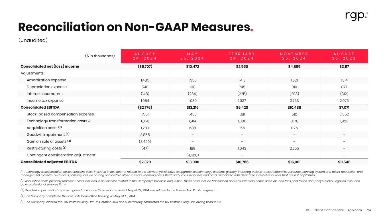RGP. Client Confidential. | rgp.com | 24 (Unaudited) Reconciliation on Non-GAAP Measures. (1) Technology transformation costs represent costs included in net income related to the Company’s initiative to upgrade its technology platform globally, including a cloud-based enterprise resource planning system and talent acquisition and management systems. Such costs primarily include hosting and certain other software licensing costs, third-party consulting fees and costs associated with dedicated internal resources that are not capitalized. (2) Acquisition costs primarily represent costs included in net income related to the Company’s business acquisition. These costs include transaction bonuses, retention bonus accruals, and fees paid to the Company's broker, legal counsel, and other professional services firms. (3) Goodwill impairment charge recognized during the three months ended August 24, 2024 was related to the Europe Asia Pacific segment. (4) The Company completed the sale of its Irvine office building on August 15, 2024. (5) The Company initiated the “U.S. Restructuring Plan” in October 2023 and substantially completed the U.S. Restructuring Plan during fiscal 2024. A U G U S T 2 4 , 2 0 2 4 M A Y 2 5 , 2 0 2 4 F E B R U A R Y 2 4 , 2 0 2 4 N O V E M B E R 2 5 , 2 0 2 4 A U G U S T 2 6 , 2 0 2 3 Consolidated net (loss) income ($5,707) $10,472 $2,550 $4,895 $3,117 Adjustments: Amortization expense 1,485 1,330 1,413 1,321 1,314 Depreciation expense 540 618 745 810 877 Interest income, net (148) (234) (225) (293) (312) Income tax expense 1,054 1,030 1,937 3,753 2,075 Consolidated EBITDA ($2,776) $13,216 $6,420 $10,486 $7,071 Stock-based compensation expense 1,561 1,483 1,181 516 2,552 Technology transformation costs (1) 1,858 1,914 1,386 1,678 1,923 Acquisition costs (2) 1,289 688 156 1,126 – Goodwill impairment (3) 3,855 – – – – Gain on sale of assets (4) (3,420) – – – – Restructuring costs (5) (47) 189 1,643 2,255 – Contingent consideration adjustment – (4,400) – – – Consolidated adjusted EBITDA $2,320 $13,090 $10,786 $16,061 $11,546 ($ in thousands)