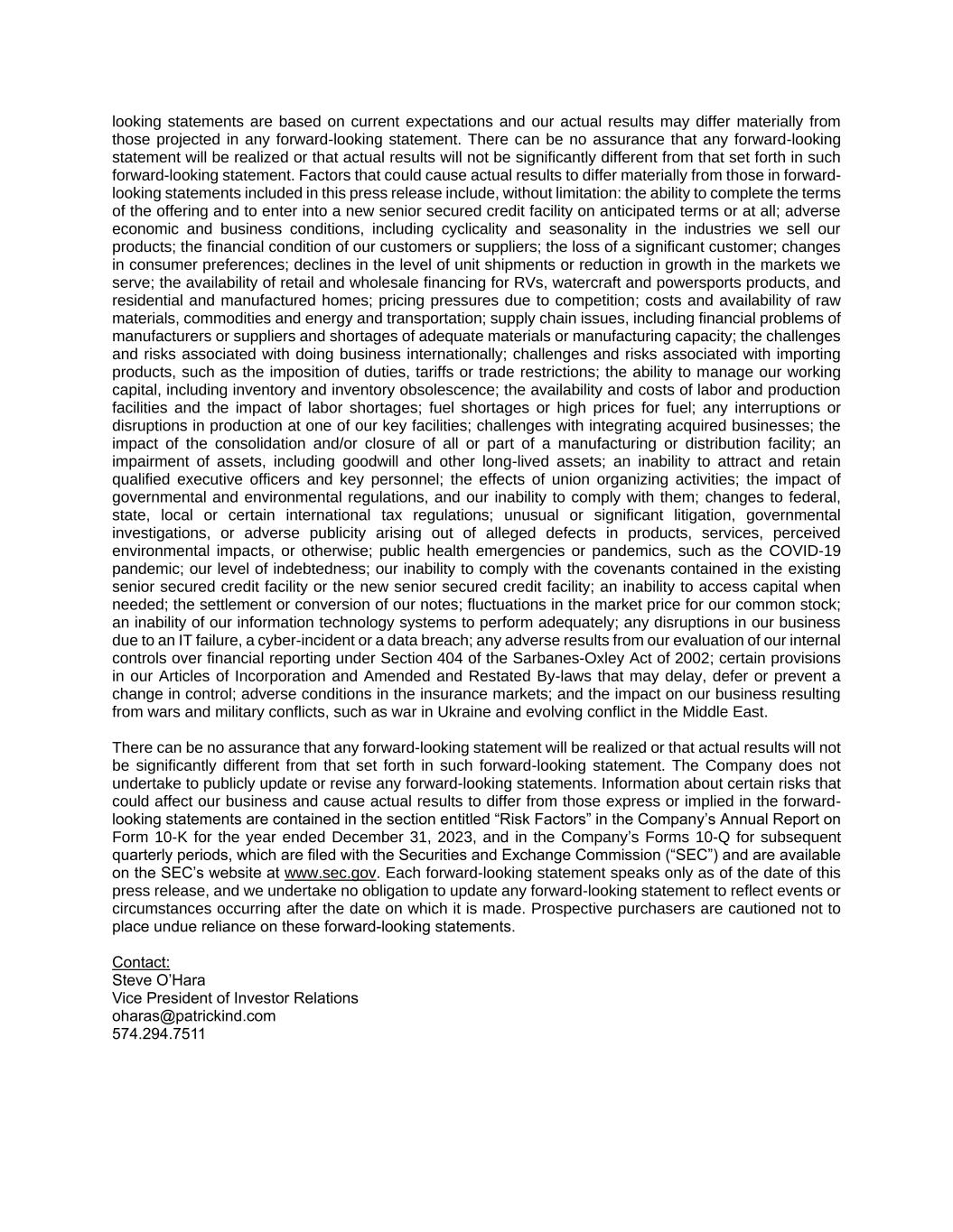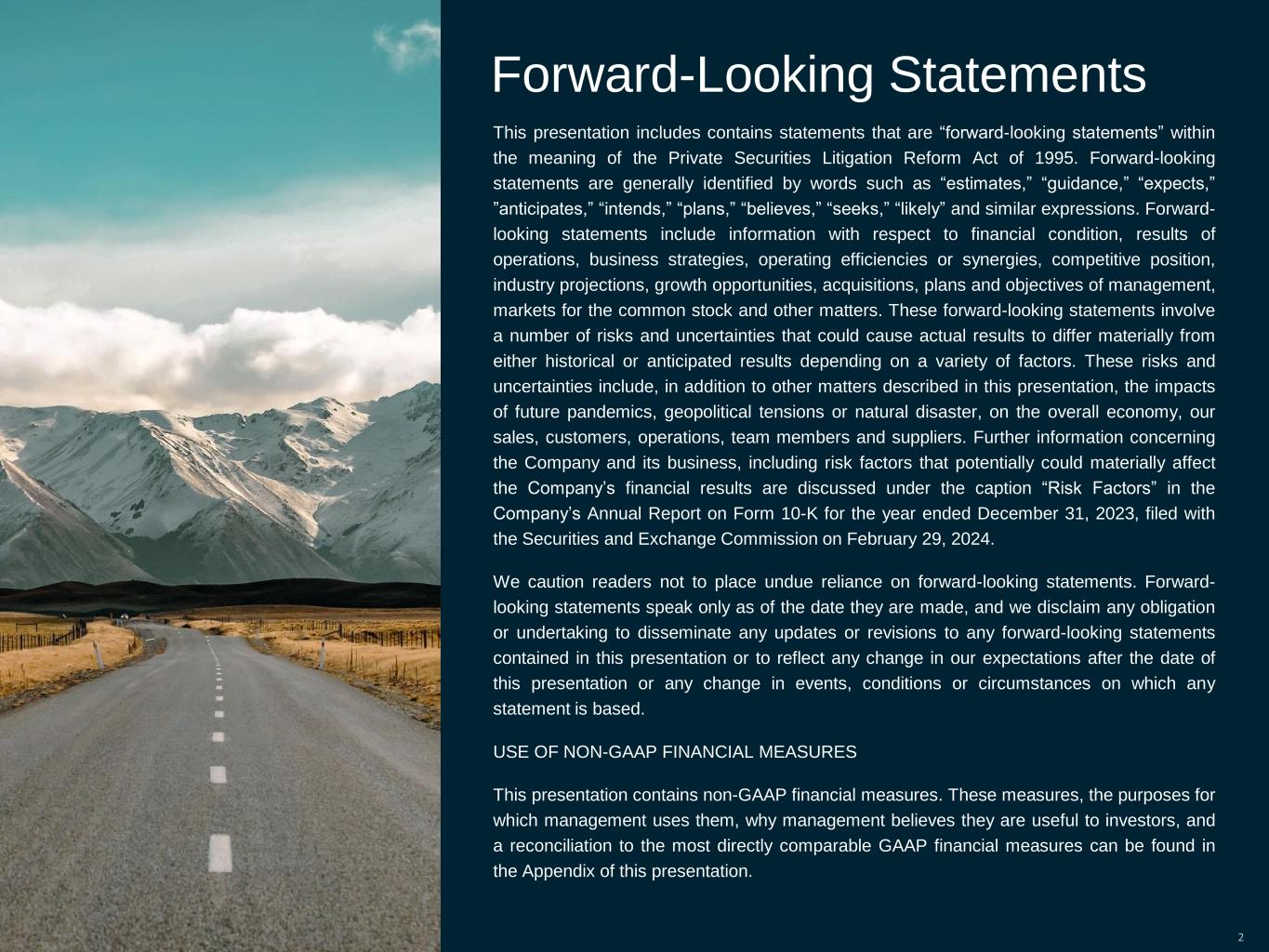 This presentation includes contains statements that are “forward-looking statements” within the meaning of the Private Securities Litigation Reform Act of 1995. Forward-looking statements are generally identified by words such as “estimates,” “guidance,” “expects,” ”anticipates,” “intends,” “plans,” “believes,” “seeks,” “likely” and similar expressions. Forward- looking statements include information with respect to financial condition, results of operations, business strategies, operating efficiencies or synergies, competitive position, industry projections, growth opportunities, acquisitions, plans and objectives of management, markets for the common stock and other matters. These forward-looking statements involve a number of risks and uncertainties that could cause actual results to differ materially from either historical or anticipated results depending on a variety of factors. These risks and uncertainties include, in addition to other matters described in this presentation, the impacts of future pandemics, geopolitical tensions or natural disaster, on the overall economy, our sales, customers, operations, team members and suppliers. Further information concerning the Company and its business, including risk factors that potentially could materially affect the Company’s financial results are discussed under the caption “Risk Factors” in the Company’s Annual Report on Form 10-K for the year ended December 31, 2023, filed with the Securities and Exchange Commission on February 29, 2024. We caution readers not to place undue reliance on forward-looking statements. Forward- looking statements speak only as of the date they are made, and we disclaim any obligation or undertaking to disseminate any updates or revisions to any forward-looking statements contained in this presentation or to reflect any change in our expectations after the date of this presentation or any change in events, conditions or circumstances on which any statement is based. USE OF NON-GAAP FINANCIAL MEASURES This presentation contains non-GAAP financial measures. These measures, the purposes for which management uses them, why management believes they are useful to investors, and a reconciliation to the most directly comparable GAAP financial measures can be found in the Appendix of this presentation. Forward-Looking Statements 2