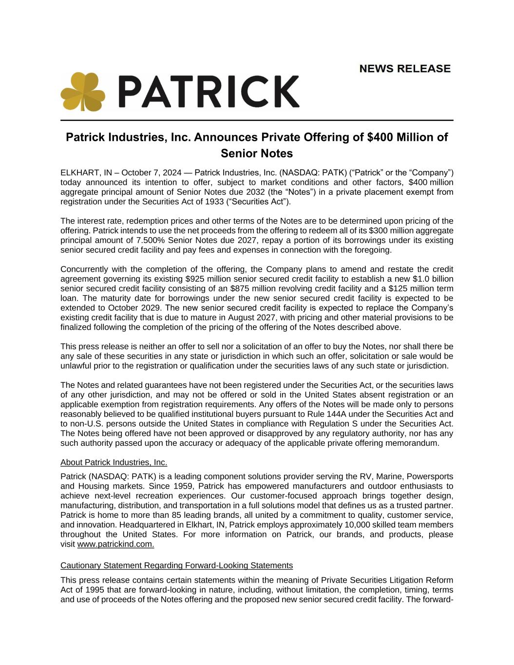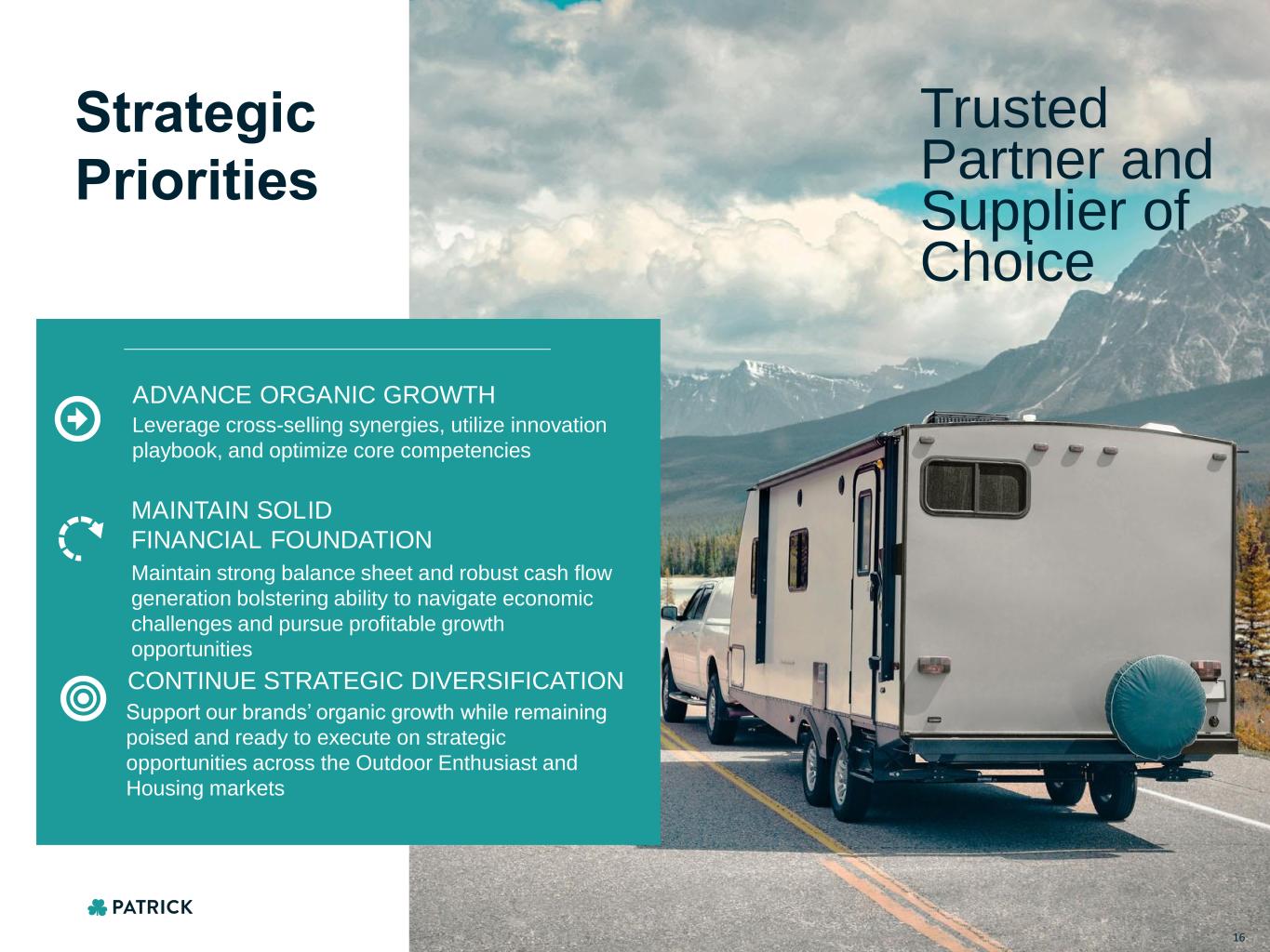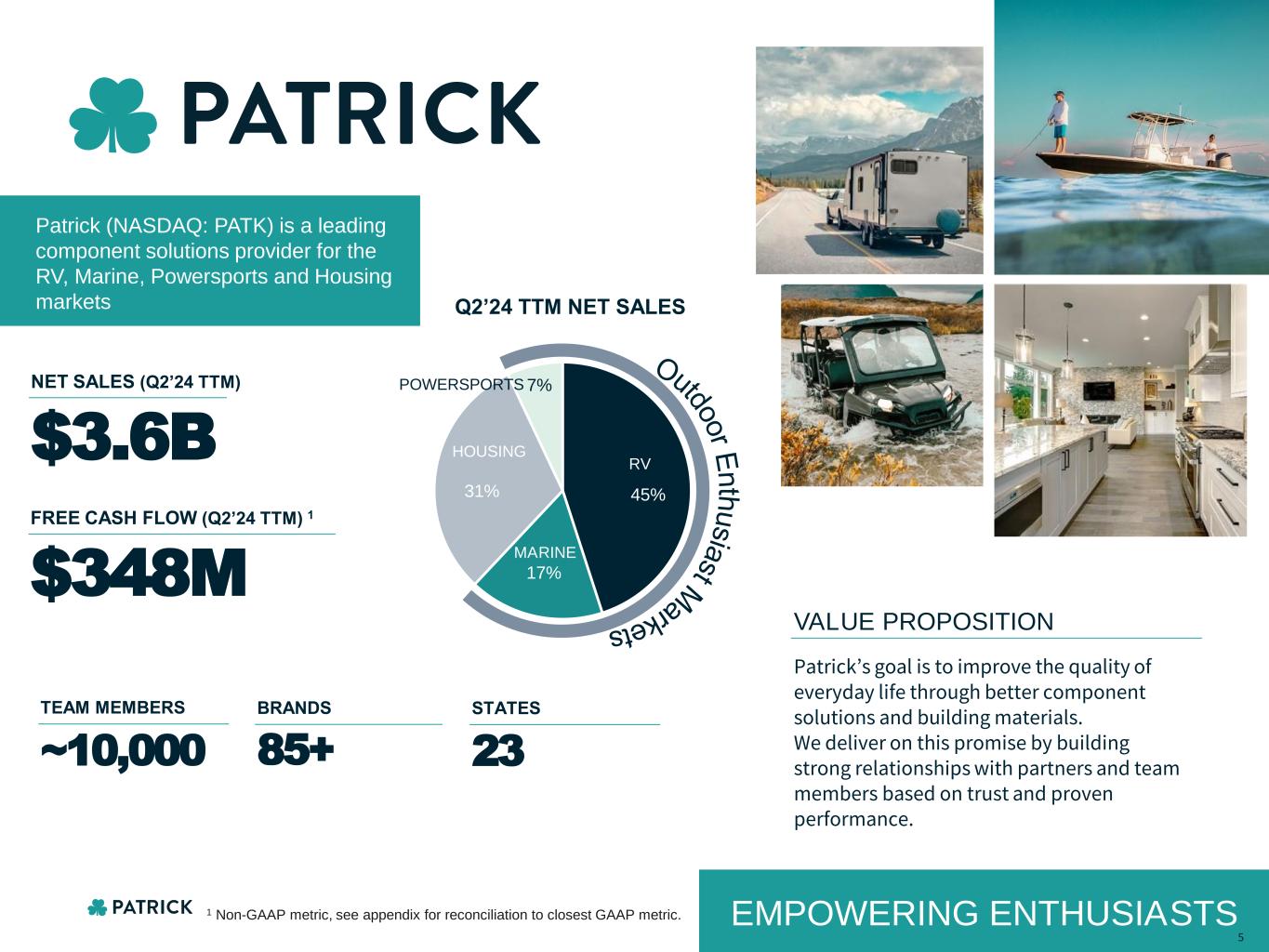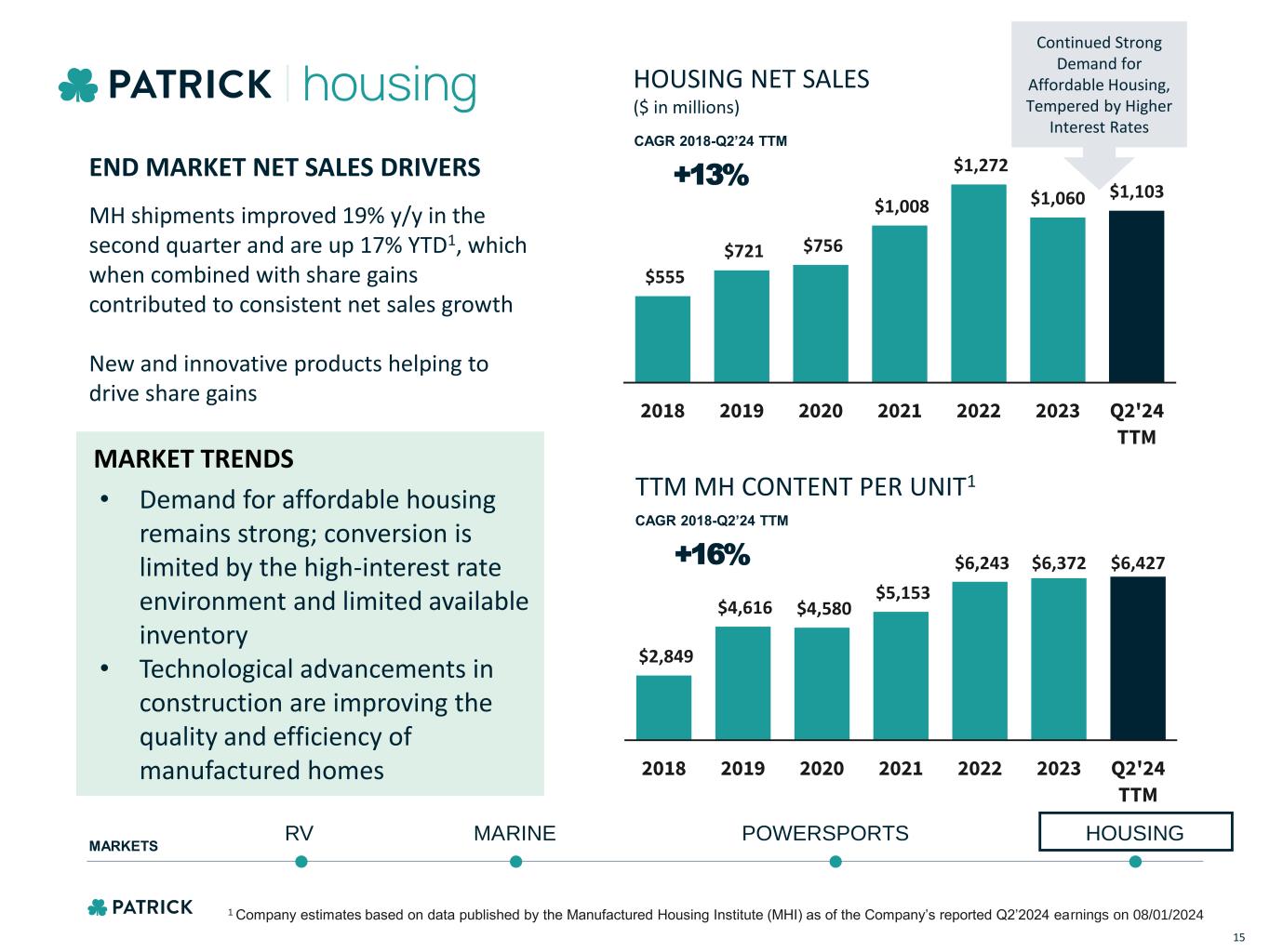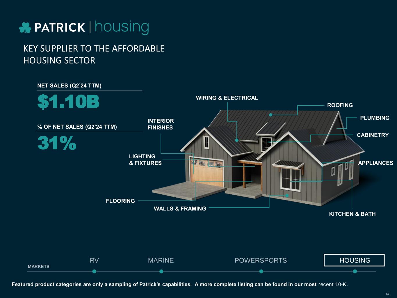 Featured product categories are only a sampling of Patrick’s capabilities. A more complete listing can be found in our most recent 10-K. KEY SUPPLIER TO THE AFFORDABLE HOUSING SECTOR MARINE POWERSPORTS HOUSINGRV MARKETS $1.10B NET SALES (Q2’24 TTM) % OF NET SALES (Q2’24 TTM) 31% LIGHTING & FIXTURES CABINETRY APPLIANCES ROOFING WALLS & FRAMING FLOORING WIRING & ELECTRICAL PLUMBING INTERIOR FINISHES KITCHEN & BATH 14