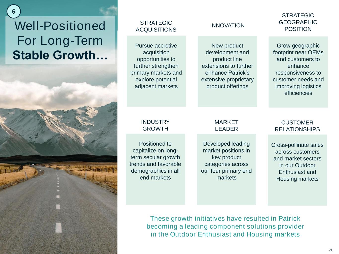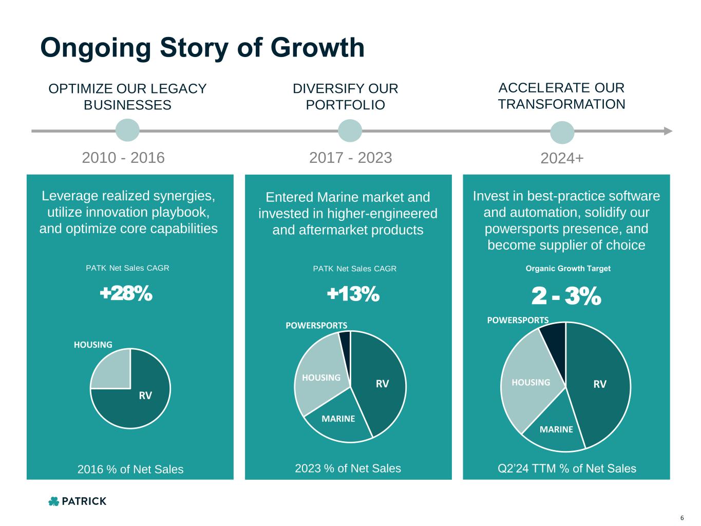 EMPOWERING ENTHUSIASTS Outdoo r E n th u sia stM arkets 5 Q2’24 TTM NET SALES 45% 17% 31% 7%POWERSPORTS RV HOUSING MARINE ~10,000 TEAM MEMBERS BRANDS 85+ STATES 23 NET SALES (Q2’24 TTM) $3.6B VALUE PROPOSITION Patrick (NASDAQ: PATK) is a leading component solutions provider for the RV, Marine, Powersports and Housing markets Patrick’s goal is to improve the quality of everyday life through better component solutions and building materials. We deliver on this promise by building strong relationships with partners and team members based on trust and proven performance. FREE CASH FLOW (Q2’24 TTM) 1 $348M 1 Non-GAAP metric, see appendix for reconciliation to closest GAAP metric.