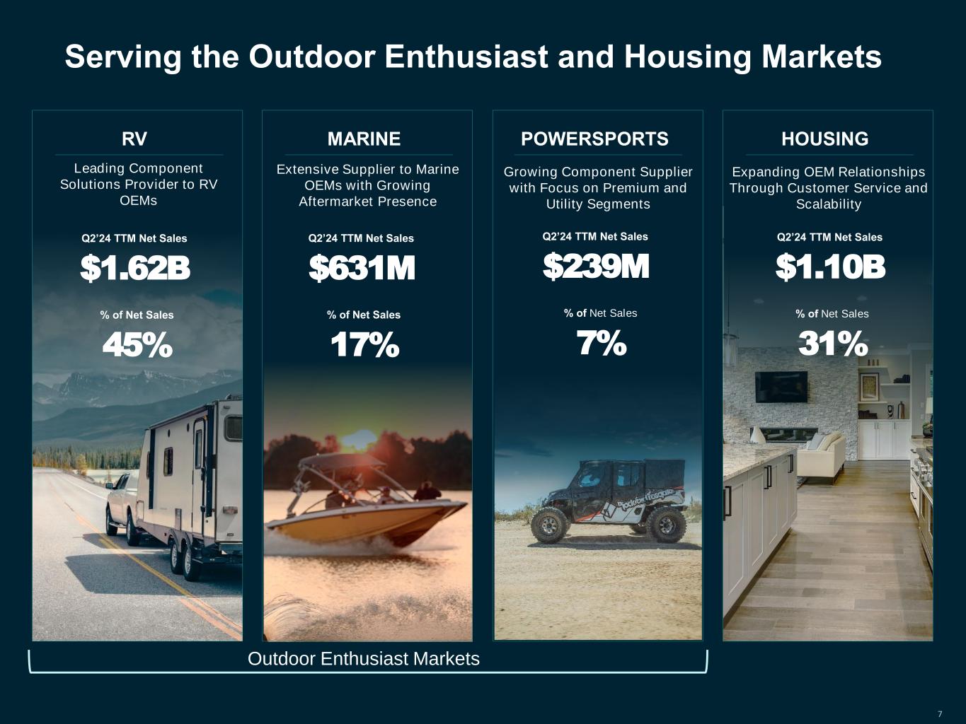 6 2010 - 2016 2017 - 2023 2024+ OPTIMIZE OUR LEGACY BUSINESSES DIVERSIFY OUR PORTFOLIO ACCELERATE OUR TRANSFORMATION Leverage realized synergies, utilize innovation playbook, and optimize core capabilities +28% PATK Net Sales CAGR Entered Marine market and invested in higher-engineered and aftermarket products Invest in best-practice software and automation, solidify our powersports presence, and become supplier of choice 2 - 3% Organic Growth Target +13% PATK Net Sales CAGR RV HOUSING RVHOUSING MARINE 2016 % of Net Sales 2023 % of Net Sales Q2’24 TTM % of Net Sales RV HOUSING MARINE POWERSPORTS POWERSPORTS Ongoing Story of Growth