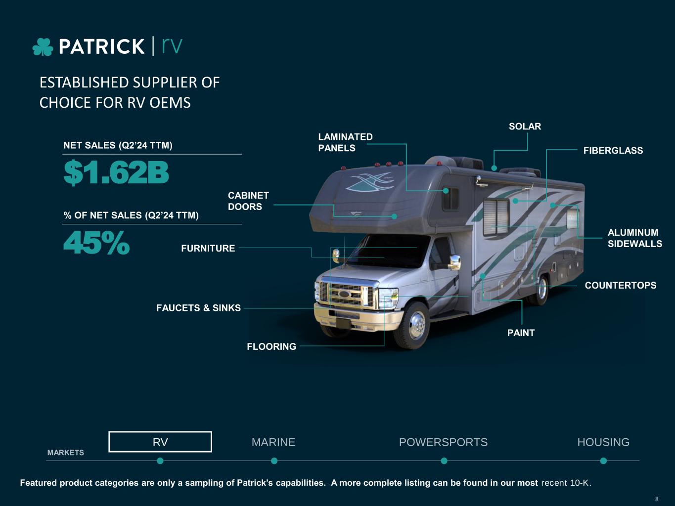 7 Serving the Outdoor Enthusiast and Housing Markets POWERSPORTSRV HOUSING Leading Component Solutions Provider to RV OEMs $1.62B Q2’24 TTM Net Sales 45% % of Net Sales $239M Q2’24 TTM Net Sales 7% % of Net Sales Expanding OEM Relationships Through Customer Service and Scalability $1.10B Q2’24 TTM Net Sales 31% % of Net Sales Growing Component Supplier with Focus on Premium and Utility Segments MARINE Extensive Supplier to Marine OEMs with Growing Aftermarket Presence $631M Q2’24 TTM Net Sales 17% % of Net Sales Outdoor Enthusiast Markets