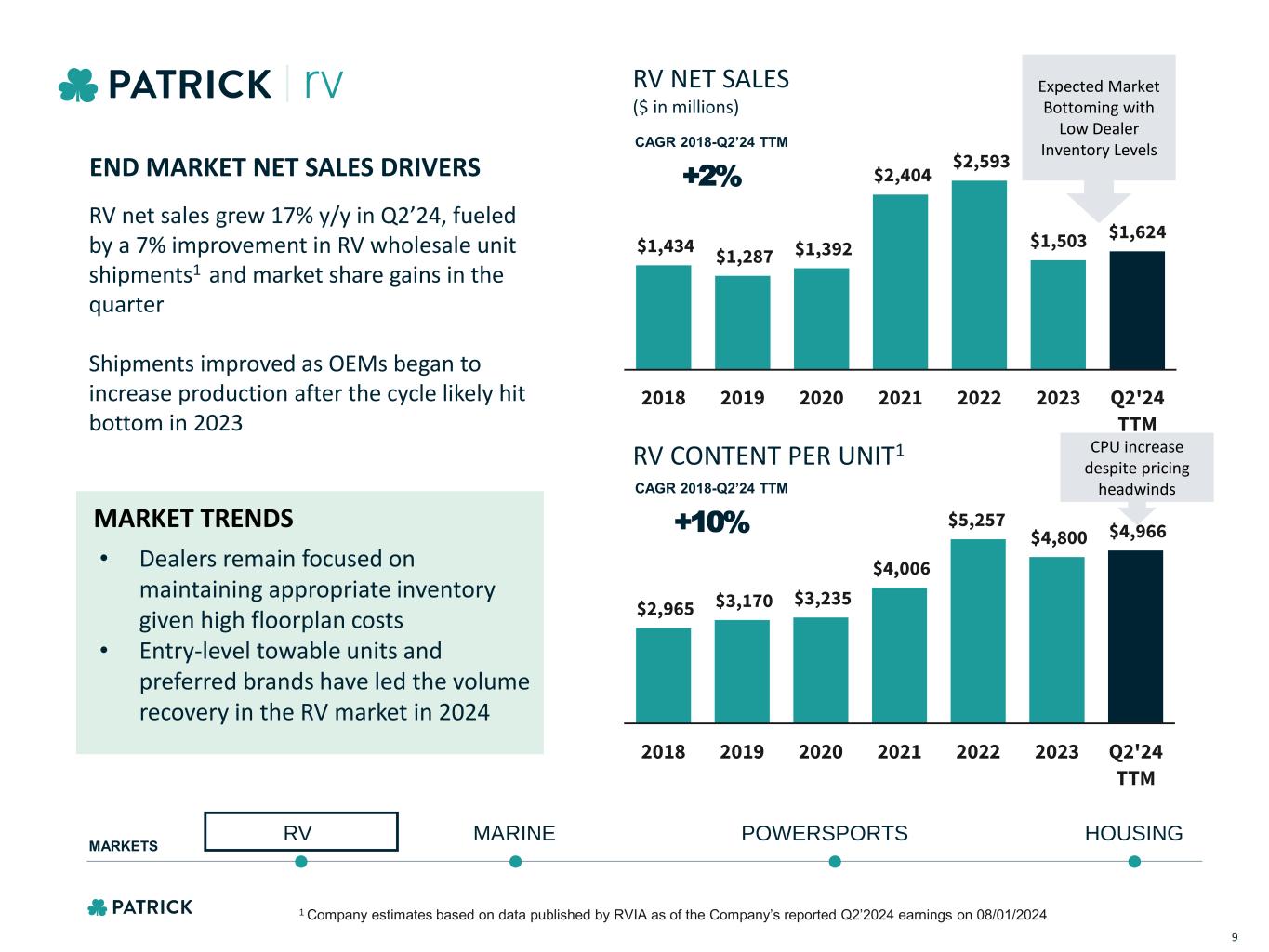 ESTABLISHED SUPPLIER OF CHOICE FOR RV OEMS MARINE POWERSPORTS HOUSINGRV MARKETS $1.62B NET SALES (Q2’24 TTM) % OF NET SALES (Q2’24 TTM) 45% CABINET DOORS FURNITURE PAINT ALUMINUM SIDEWALLS FIBERGLASS FLOORING LAMINATED PANELS FAUCETS & SINKS SOLAR COUNTERTOPS Featured product categories are only a sampling of Patrick’s capabilities. A more complete listing can be found in our most recent 10-K. 8