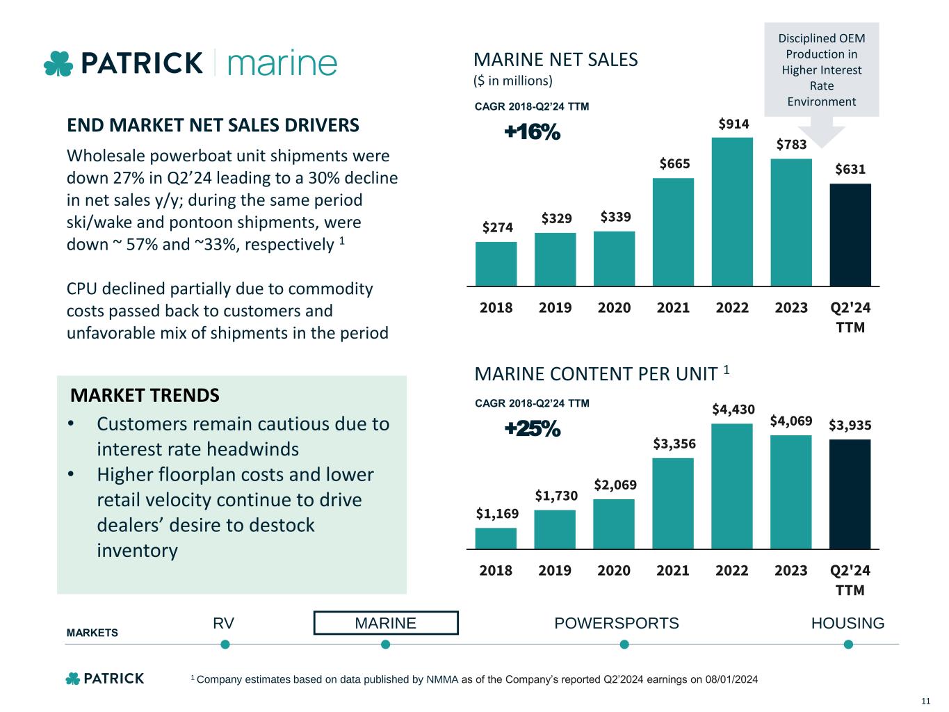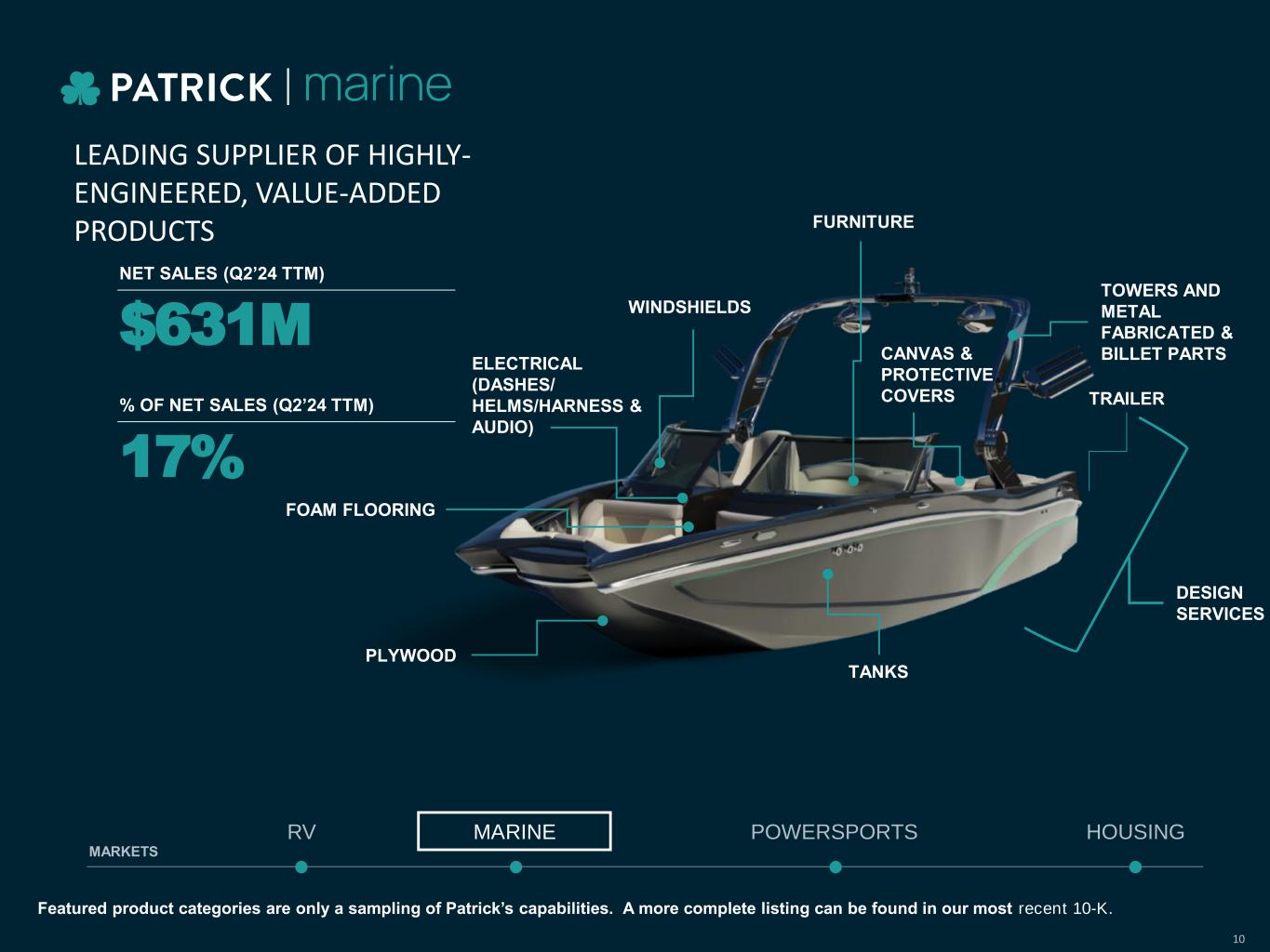MARINE POWERSPORTS HOUSINGRV MARKETS LEADING SUPPLIER OF HIGHLY- ENGINEERED, VALUE-ADDED PRODUCTS $631M NET SALES (Q2’24 TTM) % OF NET SALES (Q2’24 TTM) 17% TOWERS AND METAL FABRICATED & BILLET PARTS DESIGN SERVICES FOAM FLOORING ELECTRICAL (DASHES/ HELMS/HARNESS & AUDIO) PLYWOOD CANVAS & PROTECTIVE COVERS FURNITURE TANKS Featured product categories are only a sampling of Patrick’s capabilities. A more complete listing can be found in our most recent 10-K. WINDSHIELDS TRAILER 10