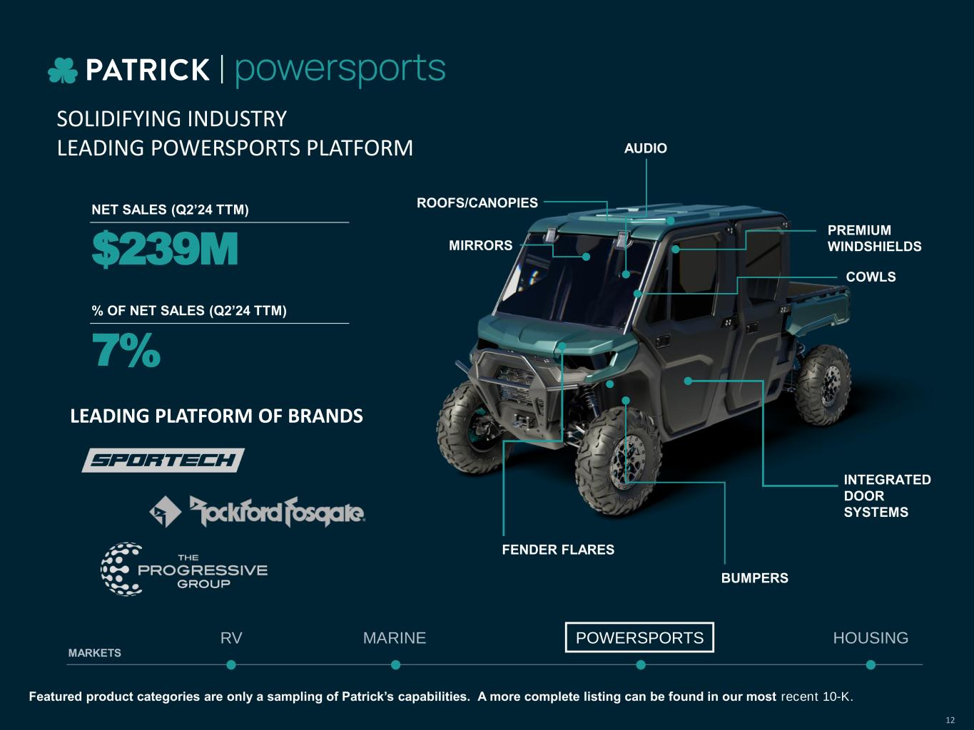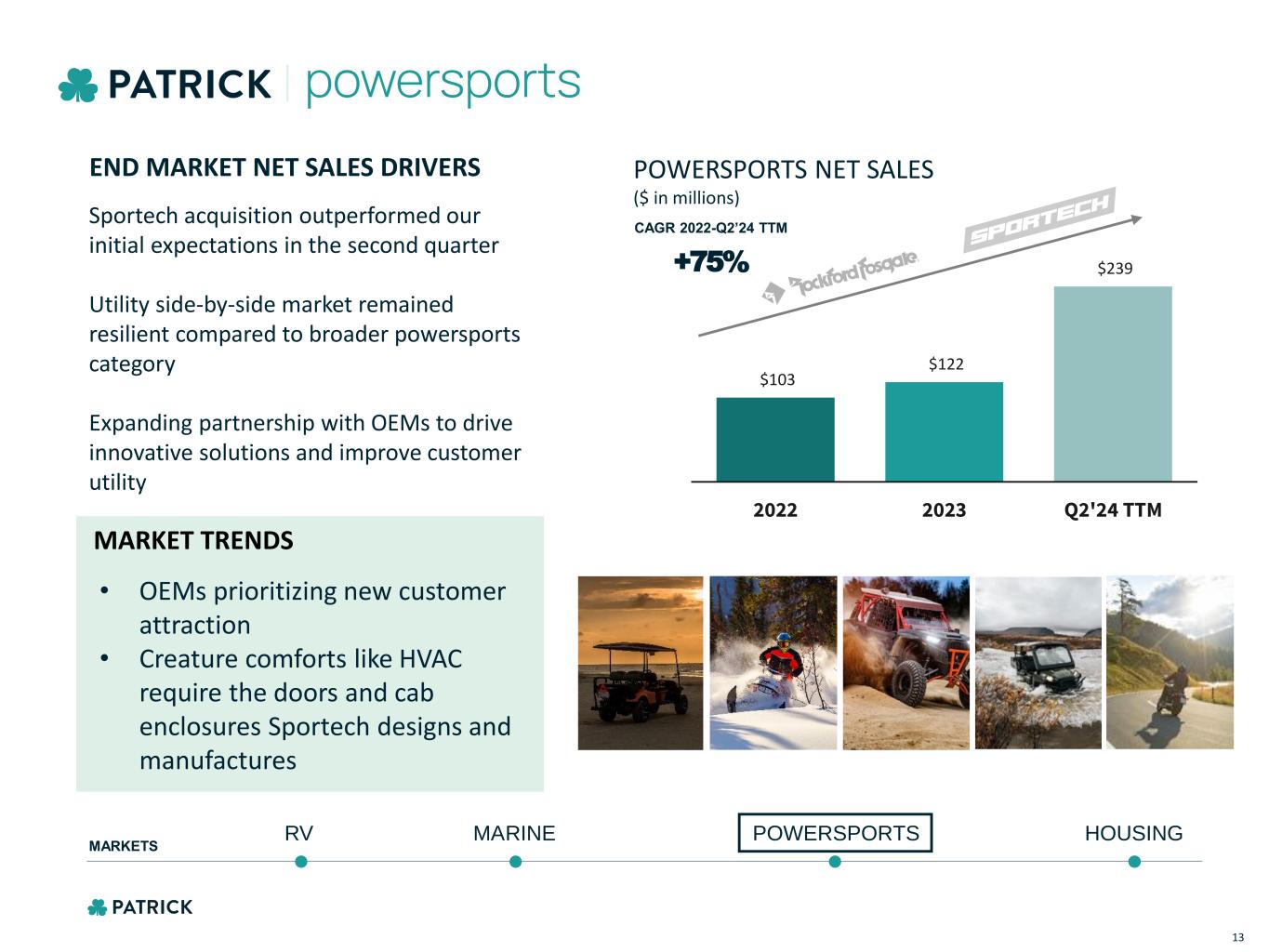 $239M NET SALES (Q2’24 TTM) % OF NET SALES (Q2’24 TTM) 7% ROOFS/CANOPIES MIRRORS PREMIUM WINDSHIELDS COWLS INTEGRATED DOOR SYSTEMS AUDIO FENDER FLARES SOLIDIFYING INDUSTRY LEADING POWERSPORTS PLATFORM MARINE POWERSPORTS HOUSINGRV MARKETS LEADING PLATFORM OF BRANDS BUMPERS Featured product categories are only a sampling of Patrick’s capabilities. A more complete listing can be found in our most recent 10-K. 12