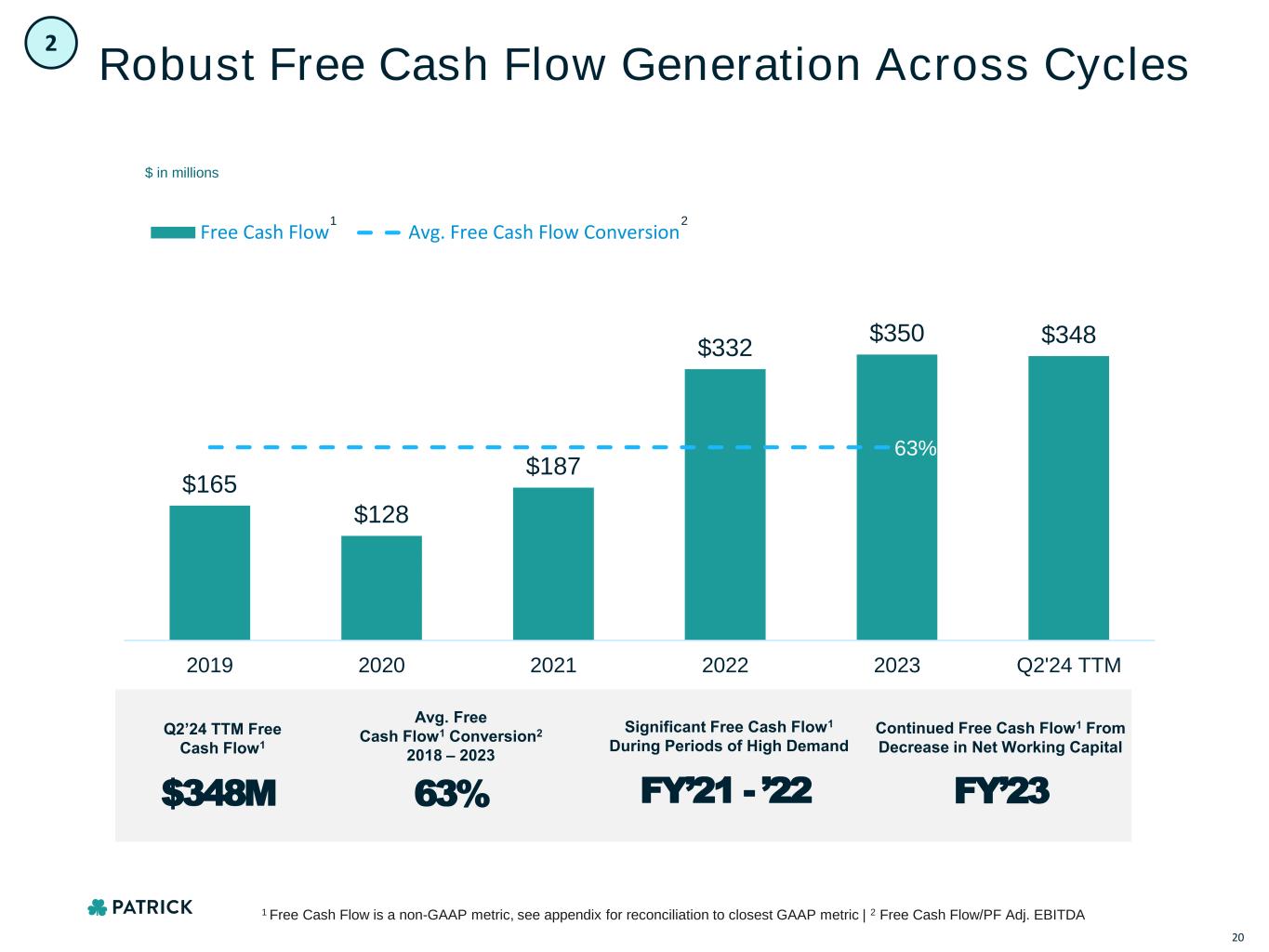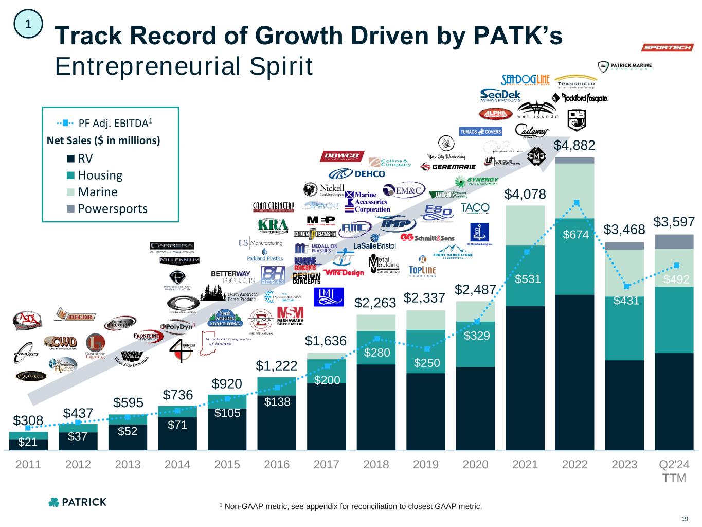 $0 $1,000,000 $2,000,000 $3,000,000 $4,000,000 $5,000,000 $6,000,000 2011 2012 2013 2014 2015 2016 2017 2018 2019 2020 2021 2022 2023 Q2'24 TTM RV Housing Marine Powersports $21 $37 $52 $71 $105 $138 $200 $280 $250 $329 $531 $674 $431 $492 Track Record of Growth Driven by PATK’s Entrepreneurial Spirit $308 $437 $595 $736 $920 $1,222 $1,636 $2,263 $2,337 $2,487 $4,078 $4,882 $3,468 $3,597 PF Adj. EBITDA1 Net Sales ($ in millions) 19 1 1 Non-GAAP metric, see appendix for reconciliation to closest GAAP metric.