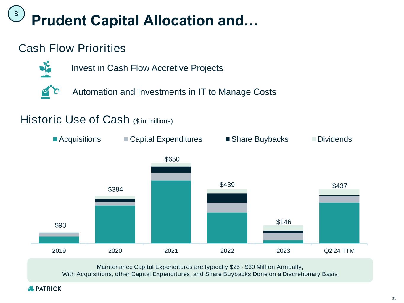 $165 $128 $187 $332 $350 $348 63% $0 $0 $0 $1 $1 $1 $1 $0 $50 $100 $150 $200 $250 $300 $350 $400 $450 2019 2020 2021 2022 2023 Q2'24 TTM Free Cash Flow Avg. Free Cash Flow Conversion $ in millions Robust Free Cash Flow Generation Across Cycles 2 FY’21 - ’22 Significant Free Cash Flow1 During Periods of High Demand 63% Avg. Free Cash Flow1 Conversion2 2018 – 2023 $348M Q2’24 TTM Free Cash Flow1 FY’23 Continued Free Cash Flow1 From Decrease in Net Working Capital 1 20 1 Free Cash Flow is a non-GAAP metric, see appendix for reconciliation to closest GAAP metric | 2 Free Cash Flow/PF Adj. EBITDA 2
