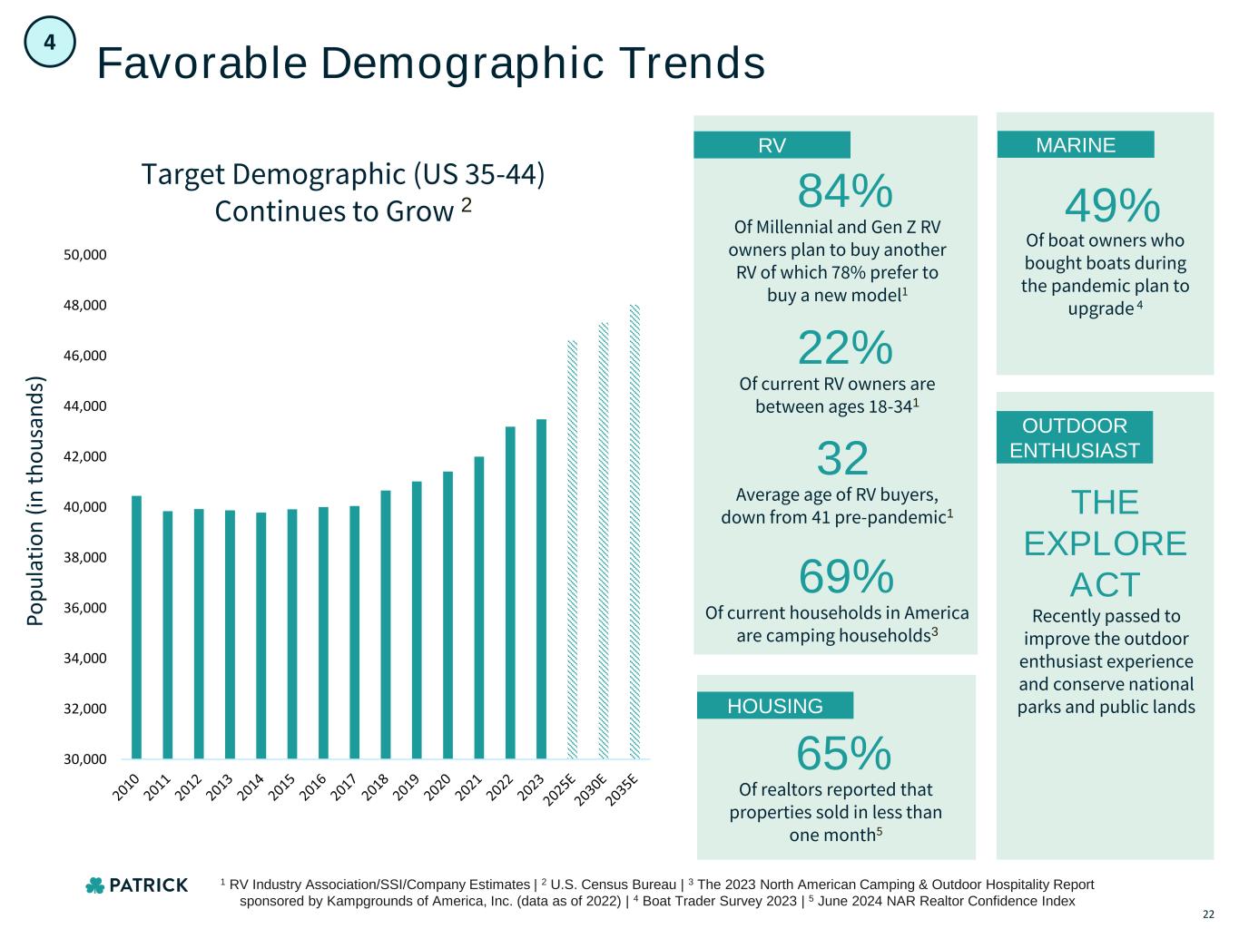 Favorable Demographic Trends Target Demographic (US 35-44) Continues to Grow 2 HOUSING RV MARINE OUTDOOR ENTHUSIAST Of current RV owners are between ages 18-341 22% Of Millennial and Gen Z RV owners plan to buy another RV of which 78% prefer to buy a new model1 84% Of realtors reported that properties sold in less than one month5 65% Of current households in America are camping households3 69% Of boat owners who bought boats during the pandemic plan to upgrade 4 49% Recently passed to improve the outdoor enthusiast experience and conserve national parks and public lands THE EXPLORE ACT Po p u la ti o n ( in t h o u sa n d s) 30,000 32,000 34,000 36,000 38,000 40,000 42,000 44,000 46,000 48,000 50,000 4 22 1 RV Industry Association/SSI/Company Estimates | 2 U.S. Census Bureau | 3 The 2023 North American Camping & Outdoor Hospitality Report sponsored by Kampgrounds of America, Inc. (data as of 2022) | 4 Boat Trader Survey 2023 | 5 June 2024 NAR Realtor Confidence Index Average age of RV buyers, down from 41 pre-pandemic1 32