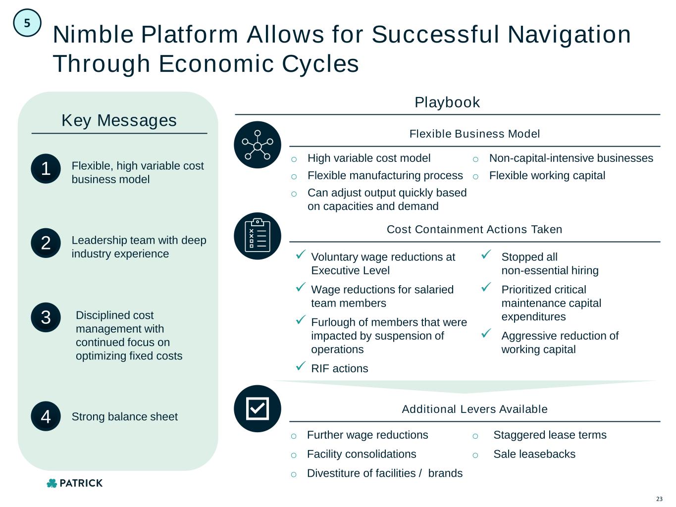 o High variable cost model o Flexible manufacturing process o Can adjust output quickly based on capacities and demand o Non-capital-intensive businesses o Flexible working capital Nimble Platform Allows for Successful Navigation Through Economic Cycles Flexible, high variable cost business model 1 Leadership team with deep industry experience 2 Disciplined cost management with continued focus on optimizing fixed costs 3 Strong balance sheet4 Key Messages ✓ Voluntary wage reductions at Executive Level ✓ Wage reductions for salaried team members ✓ Furlough of members that were impacted by suspension of operations ✓ RIF actions ✓ Stopped all non-essential hiring ✓ Prioritized critical maintenance capital expenditures ✓ Aggressive reduction of working capital o Further wage reductions o Facility consolidations o Divestiture of facilities / brands o Staggered lease terms o Sale leasebacks Playbook Flexible Business Model Cost Containment Actions Taken Additional Levers Available 5 23