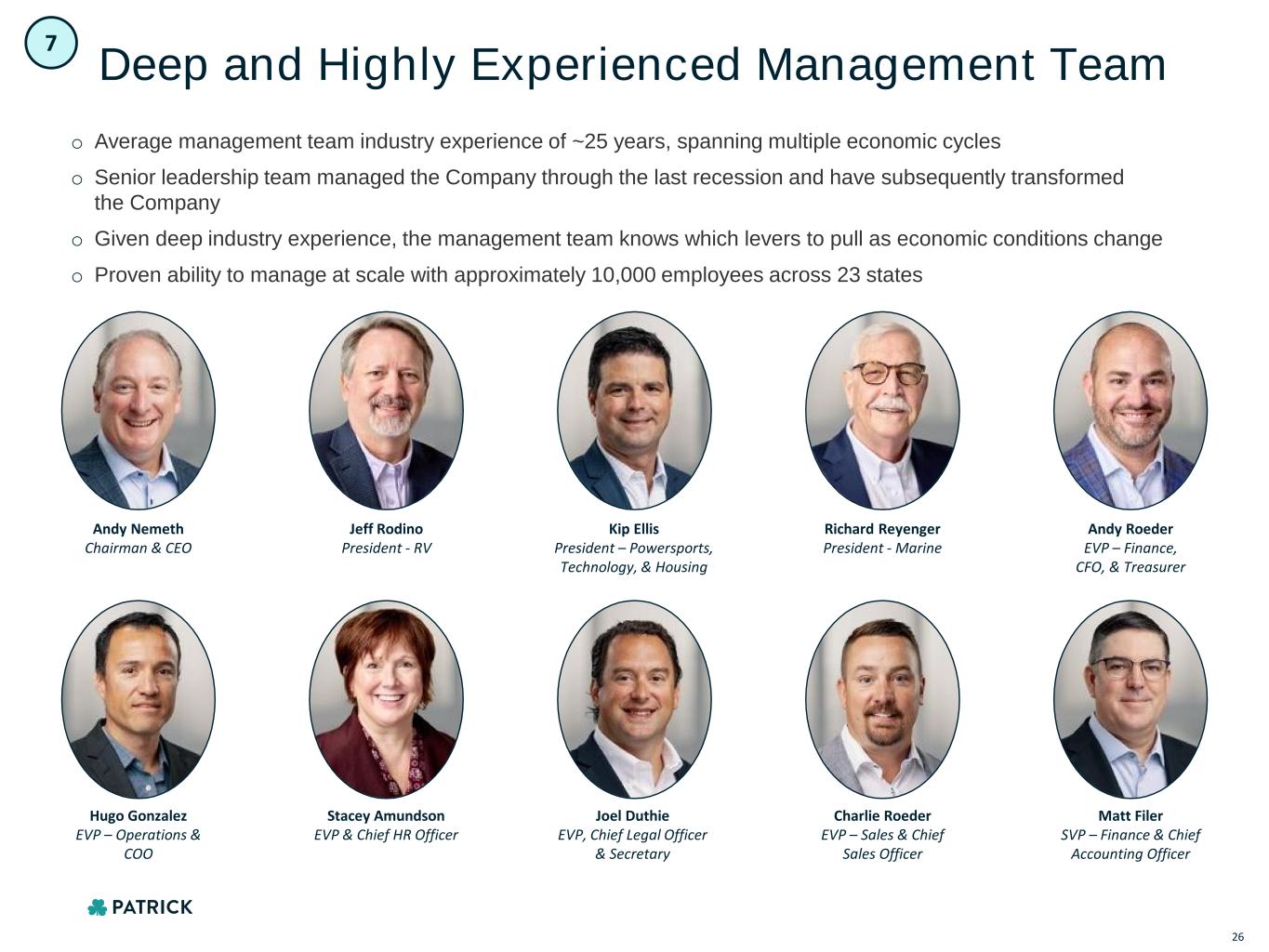 Deep and Highly Experienced Management Team o Average management team industry experience of ~25 years, spanning multiple economic cycles o Senior leadership team managed the Company through the last recession and have subsequently transformed the Company o Given deep industry experience, the management team knows which levers to pull as economic conditions change o Proven ability to manage at scale with approximately 10,000 employees across 23 states Andy Nemeth Chairman & CEO Jeff Rodino President - RV Kip Ellis President – Powersports, Technology, & Housing Richard Reyenger President - Marine Andy Roeder EVP – Finance, CFO, & Treasurer Hugo Gonzalez EVP – Operations & COO Stacey Amundson EVP & Chief HR Officer Joel Duthie EVP, Chief Legal Officer & Secretary Matt Filer SVP – Finance & Chief Accounting Officer Charlie Roeder EVP – Sales & Chief Sales Officer 7 26