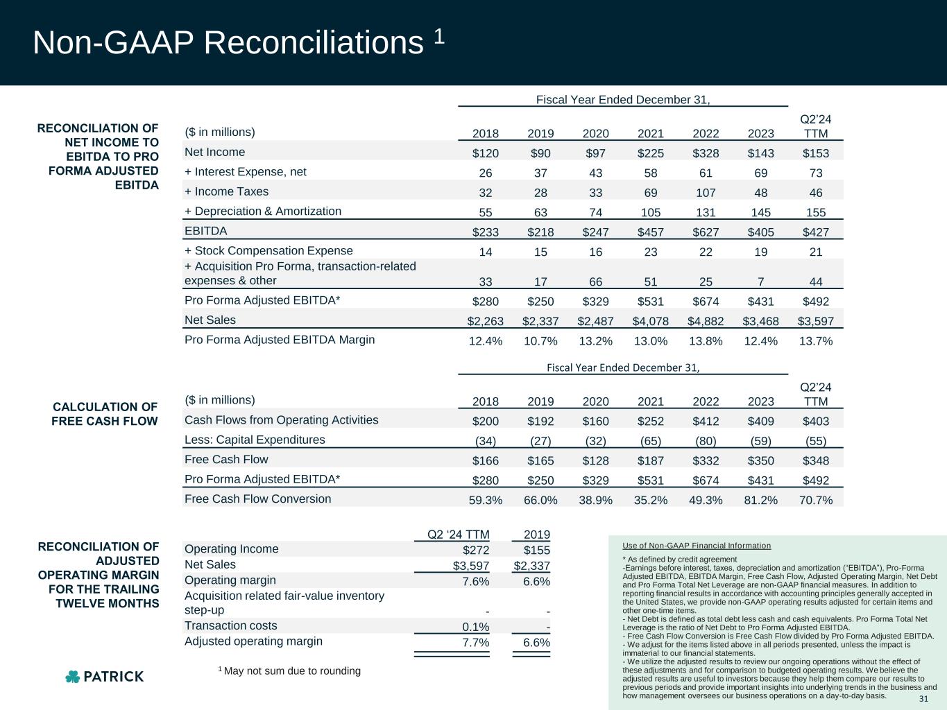 Use of Non-GAAP Financial Information * As defined by credit agreement -Earnings before interest, taxes, depreciation and amortization (“EBITDA”), Pro-Forma Adjusted EBITDA, EBITDA Margin, Free Cash Flow, Adjusted Operating Margin, Net Debt and Pro Forma Total Net Leverage are non-GAAP financial measures. In addition to reporting financial results in accordance with accounting principles generally accepted in the United States, we provide non-GAAP operating results adjusted for certain items and other one-time items. - Net Debt is defined as total debt less cash and cash equivalents. Pro Forma Total Net Leverage is the ratio of Net Debt to Pro Forma Adjusted EBITDA. - Free Cash Flow Conversion is Free Cash Flow divided by Pro Forma Adjusted EBITDA. - We adjust for the items listed above in all periods presented, unless the impact is immaterial to our financial statements. - We utilize the adjusted results to review our ongoing operations without the effect of these adjustments and for comparison to budgeted operating results. We believe the adjusted results are useful to investors because they help them compare our results to previous periods and provide important insights into underlying trends in the business and how management oversees our business operations on a day-to-day basis. Non-GAAP Reconciliations 1 RECONCILIATION OF NET INCOME TO EBITDA TO PRO FORMA ADJUSTED EBITDA Fiscal Year Ended December 31, ($ in millions) 2018 2019 2020 2021 2022 2023 Q2’24 TTM Net Income $120 $90 $97 $225 $328 $143 $153 + Interest Expense, net 26 37 43 58 61 69 73 + Income Taxes 32 28 33 69 107 48 46 + Depreciation & Amortization 55 63 74 105 131 145 155 EBITDA $233 $218 $247 $457 $627 $405 $427 + Stock Compensation Expense 14 15 16 23 22 19 21 + Acquisition Pro Forma, transaction-related expenses & other 33 17 66 51 25 7 44 Pro Forma Adjusted EBITDA* $280 $250 $329 $531 $674 $431 $492 Net Sales $2,263 $2,337 $2,487 $4,078 $4,882 $3,468 $3,597 Pro Forma Adjusted EBITDA Margin 12.4% 10.7% 13.2% 13.0% 13.8% 12.4% 13.7% 1 May not sum due to rounding Fiscal Year Ended December 31, ($ in millions) 2018 2019 2020 2021 2022 2023 Q2’24 TTM Cash Flows from Operating Activities $200 $192 $160 $252 $412 $409 $403 Less: Capital Expenditures (34) (27) (32) (65) (80) (59) (55) Free Cash Flow $166 $165 $128 $187 $332 $350 $348 Pro Forma Adjusted EBITDA* $280 $250 $329 $531 $674 $431 $492 Free Cash Flow Conversion 59.3% 66.0% 38.9% 35.2% 49.3% 81.2% 70.7% CALCULATION OF FREE CASH FLOW Q2 ‘24 TTM 2019 Operating Income $272 $155 Net Sales $3,597 $2,337 Operating margin 7.6% 6.6% Acquisition related fair-value inventory step-up - - Transaction costs 0.1% - Adjusted operating margin 7.7% 6.6% RECONCILIATION OF ADJUSTED OPERATING MARGIN FOR THE TRAILING TWELVE MONTHS 31