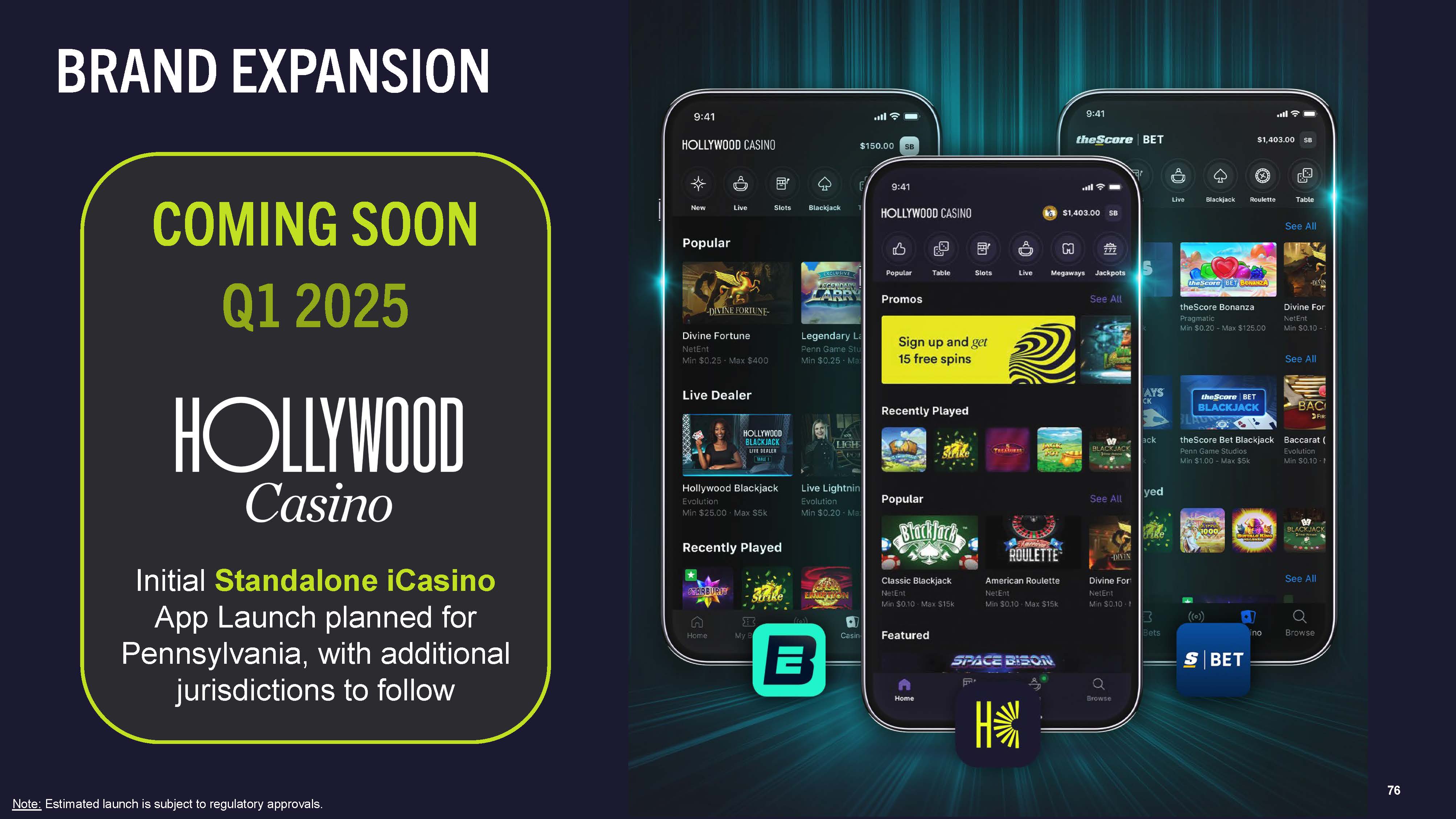 operates 43 properties in 20 states, online sports betting in 20 jurisdictions and iCasino in five jurisdictions, under a portfolio of well-recognized brands including Hollywood Casino®, L’Auberge®, ESPN BET™ and theScore BET Sportsbook and Casino®.