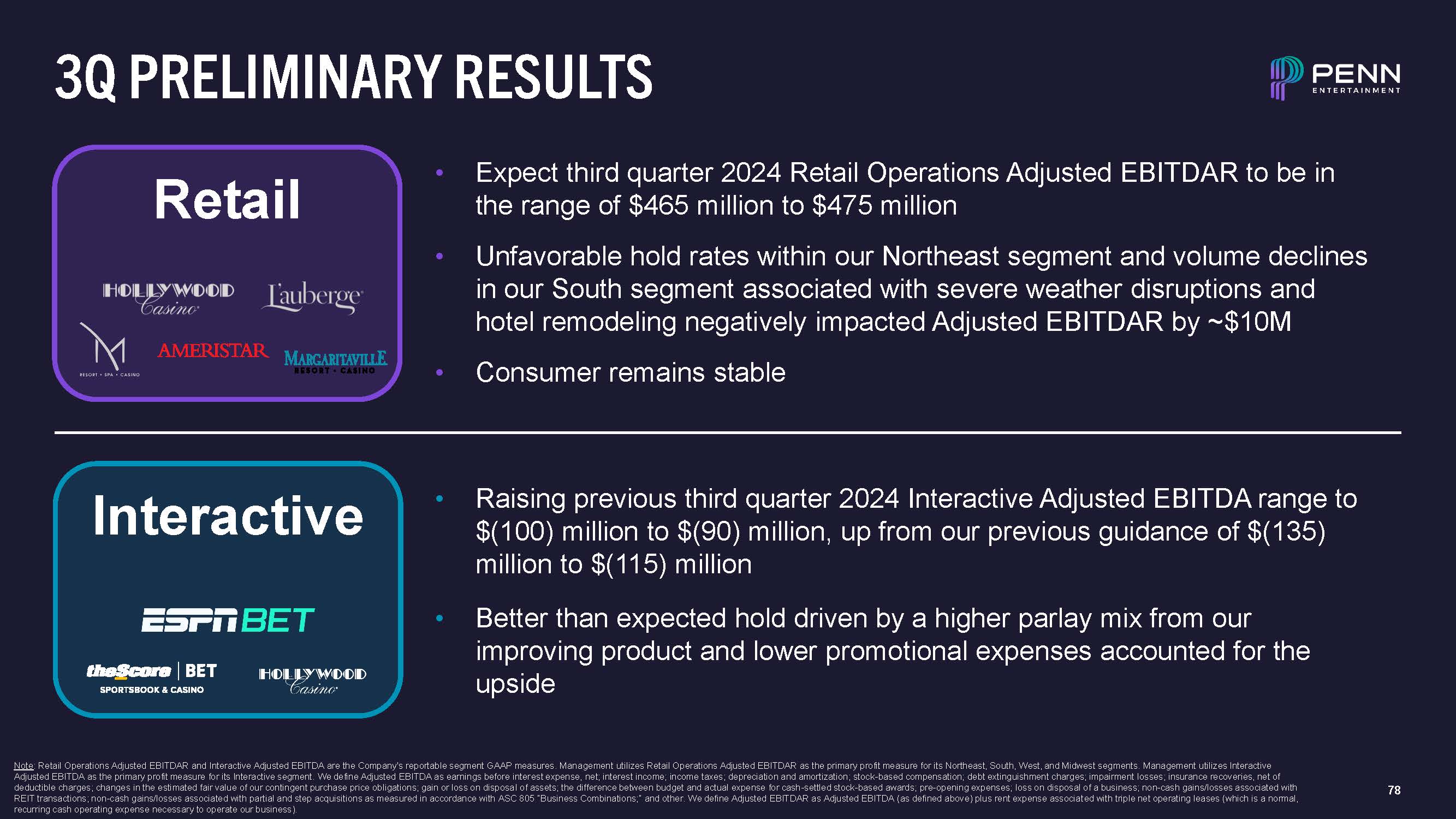 is providing an estimated range for Retail Operations Adjusted EBITDAR* and is updating its Interactive Adjusted EBITDA* estimated range, each for the third quarter 2024, as set out below.