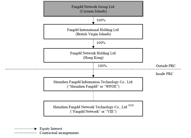 Fangdd Network Group Ltd., or Fangdd Cayman, is a Cayman Islands holding company with no material operations of its own. We conduct our operations in China primarily through our PRC subsidiary Shenzhen Fangdd Information Technology Co., Ltd., or Shenzhen Fangdd or the WFOE, the VIE Shenzhen Fangdd Network Technology Co., Ltd., or Fangdd Network or the VIE, and the VIE’s subsidiaries. Foreign investment in the business involving value-added telecommunications service (except for e-commerce, domestic conferencing, store-and-forward, and call center services), including internet real estate services, is subject to significant restrictions under current PRC laws, rules and regulations. Accordingly, these businesses are operated by the VIE and the VIE’s subsidiaries. Investors in our Class A ordinary shares thus are not purchasing equity interests in our operating entities in China but instead are purchasing equity interests in Fangdd Cayman, a Cayman Islands holding company.