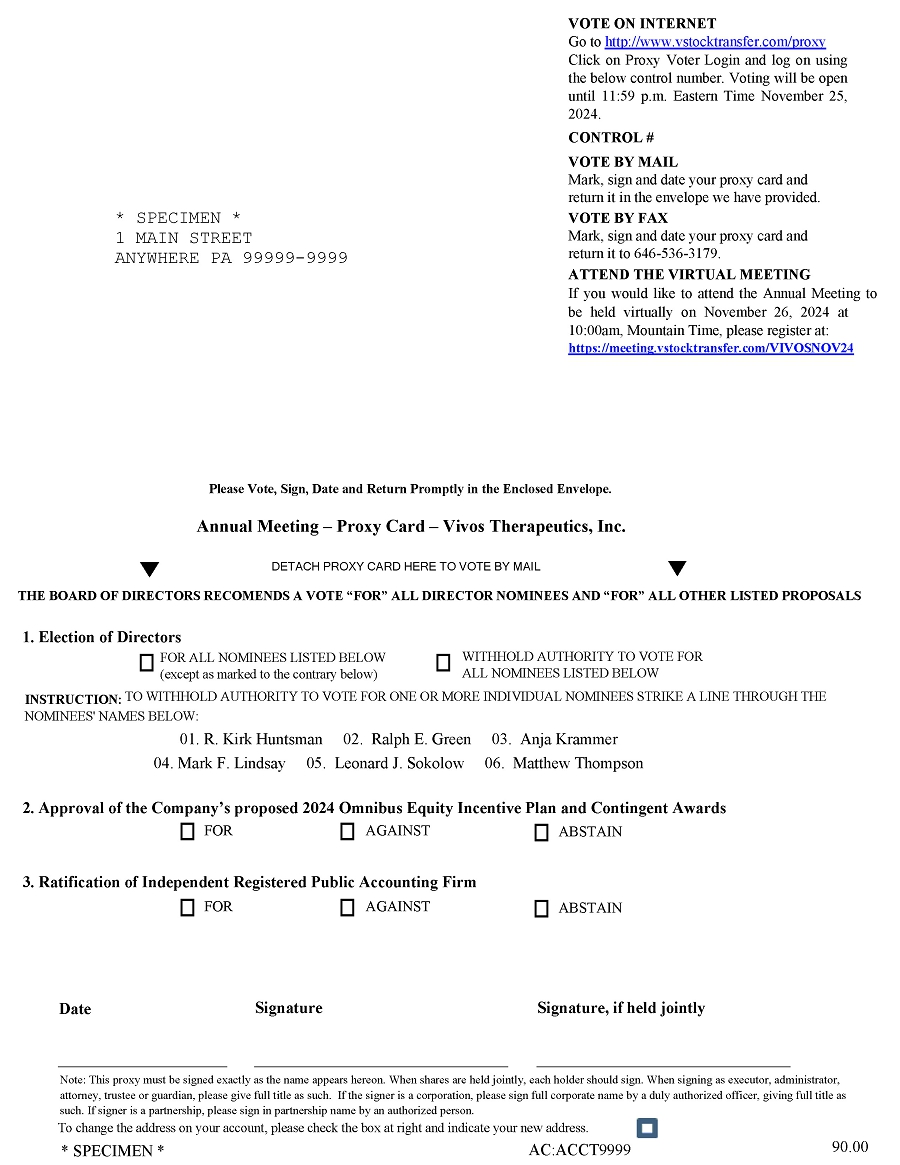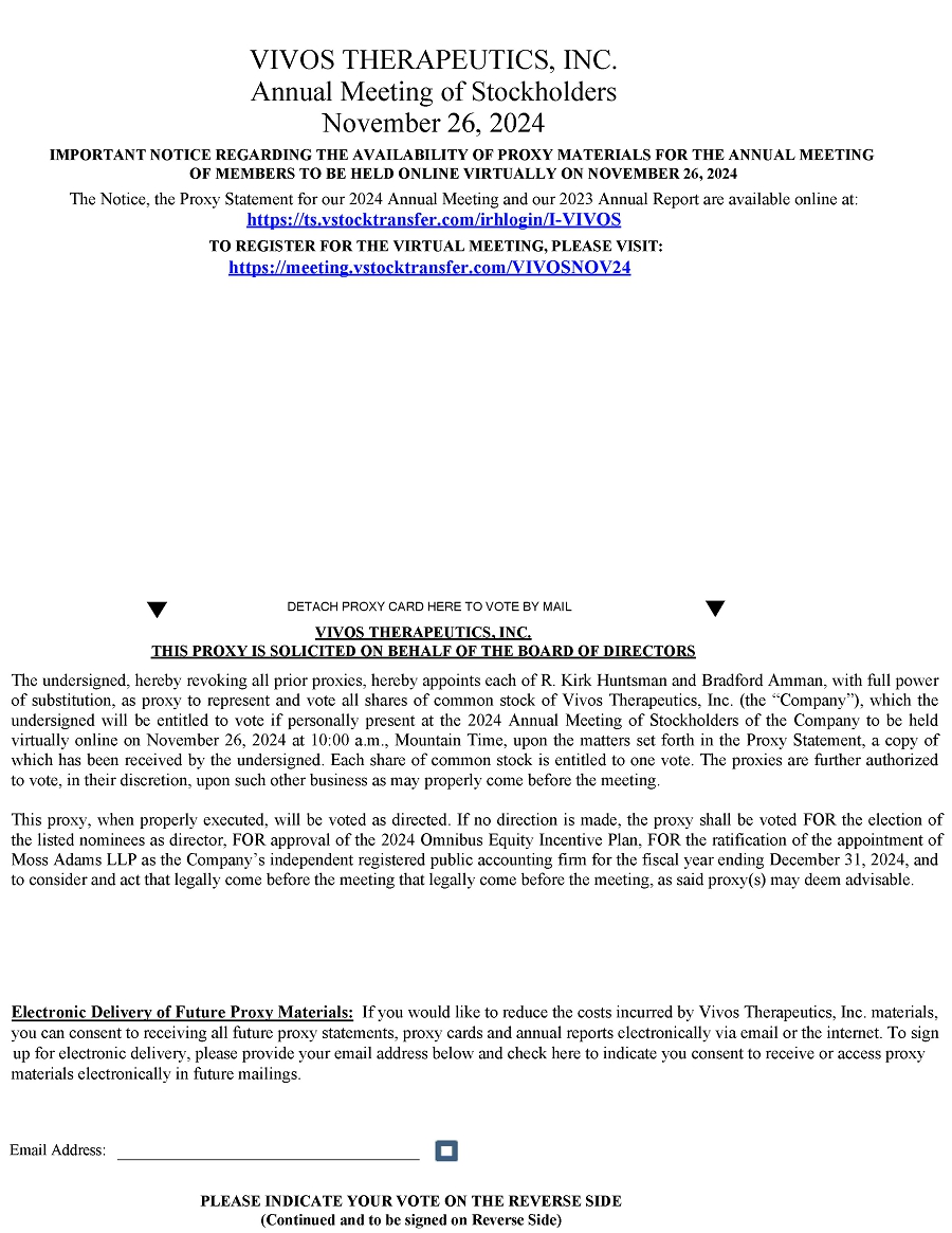 Important Notice Regarding the Availability of Proxy Materials for the Annual Meeting of Stockholders to be held on November 26, 2024: This notice of Annual Meeting, the accompanying proxy statement, and our Annual Report on Form 10-K for the fiscal year ended December 31, 2023, are available at www.vivos.com/investor-relations/. We will also be mailing these materials to our stockholders of record as of the Record Date on or about October 15, 2024.