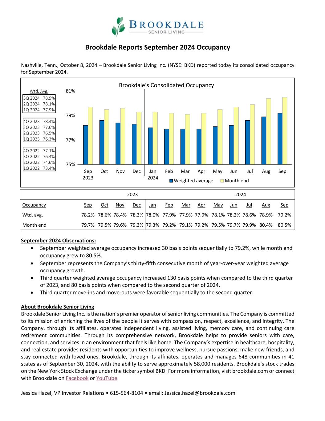 Brookdale Reports September 2024 Occupancy Nashville, Tenn., October 8, 2024 – Brookdale Senior Living Inc. (NYSE: BKD) reported today its consolidated occupancy for September 2024. 2023 2024 Occupancy Sep Oct Nov Dec Jan Feb Mar Apr May Jun Jul Aug Sep Wtd. avg. 78.2% 78.6% 78.4% 78.3% 78.0% 77.9% 77.9% 77.9% 78.1% 78.2% 78.6% 78.9% 79.2% Month end 79.7% 79.5% 79.6% 79.3% 79.3% 79.2% 79.1% 79.2% 79.5% 79.7% 79.9% 80.4% 80.5% September 2024 Observations: • September weighted average occupancy increased 30 basis points sequentially to 79.2%, while month end occupancy grew to 80.5%. • September represents the Company’s thirty‐fifth consecutive month of year‐over‐year weighted average occupancy growth. • Third quarter weighted average occupancy increased 130 basis points when compared to the third quarter of 2023, and 80 basis points when compared to the second quarter of 2024. • Third quarter move‐ins and move‐outs were favorable sequentially to the second quarter. About Brookdale Senior Living Brookdale Senior Living Inc. is the nation’s premier operator of senior living communities. The Company is committed to its mission of enriching the lives of the people it serves with compassion, respect, excellence, and integrity. The Company, through its affiliates, operates independent living, assisted living, memory care, and continuing care retirement communities. Through its comprehensive network, Brookdale helps to provide seniors with care, connection, and services in an environment that feels like home. The Company’s expertise in healthcare, hospitality, and real estate provides residents with opportunities to improve wellness, pursue passions, make new friends, and stay connected with loved ones. Brookdale, through its affiliates, operates and manages 648 communities in 41 states as of September 30, 2024, with the ability to serve approximately 58,000 residents. Brookdale's stock trades on the New York Stock Exchange under the ticker symbol BKD. For more information, visit brookdale.com or connect with Brookdale on Facebook or YouTube. Jessica Hazel, VP Investor Relations • 615‐564‐8104 • email: Jessica.hazel@brookdale.com 75% 77% 79% 81% Sep 2023 Oct Nov Dec Jan 2024 Feb Mar Apr May Jun Jul Aug Sep Weighted average Month end Wtd. Avg. 3Q 2024 78.9% 2Q 2024 78.1% 1Q 2024 77.9% 4Q 2023 78.4% 3Q 2023 77.6% 2Q 2023 76.5% 1Q 2023 76.3% 4Q 2022 77.1% 3Q 2022 76.4% 2Q 2022 74.6% 1Q 2022 73.4% Brookdale’s Consolidated Occupancy