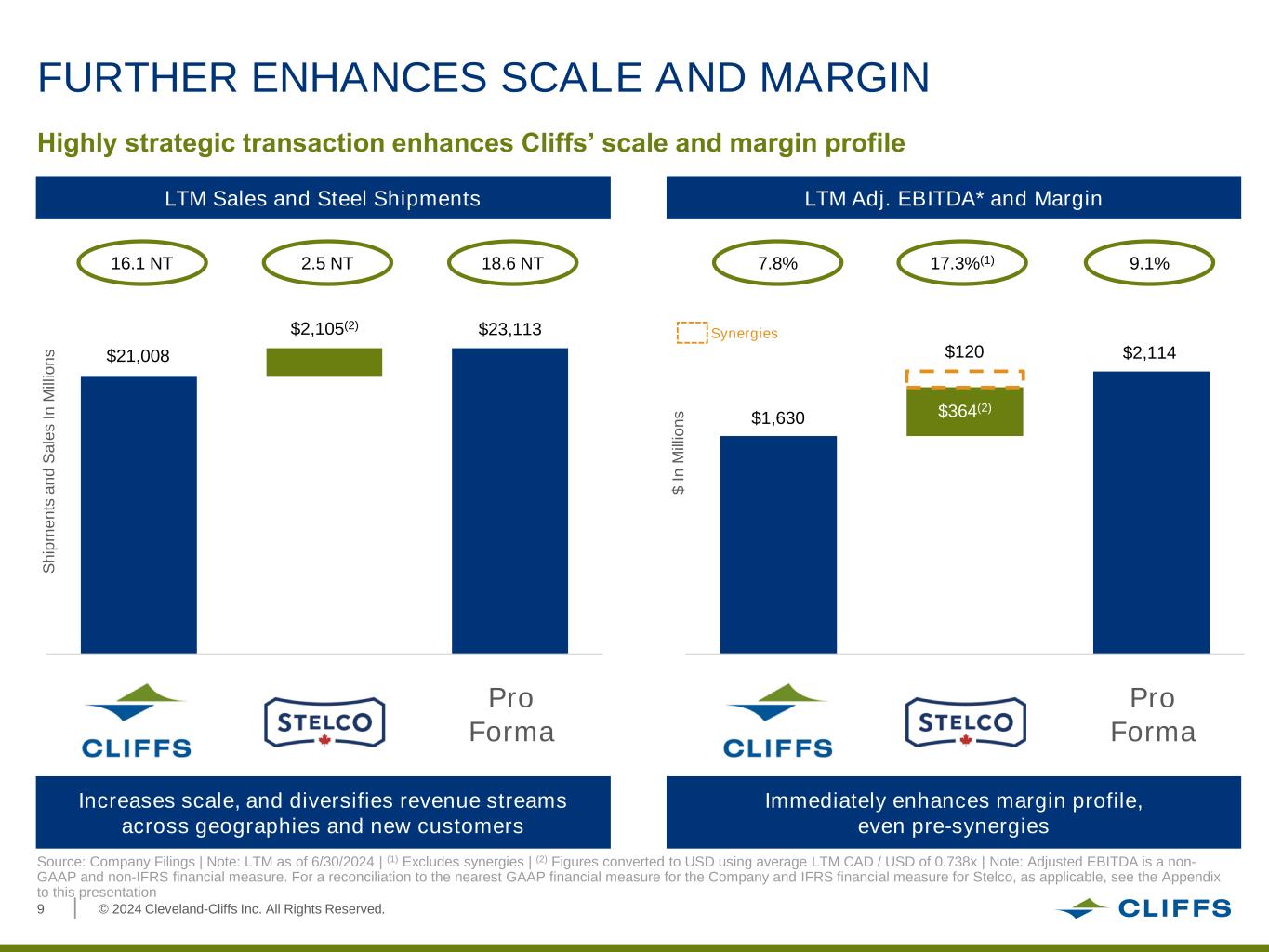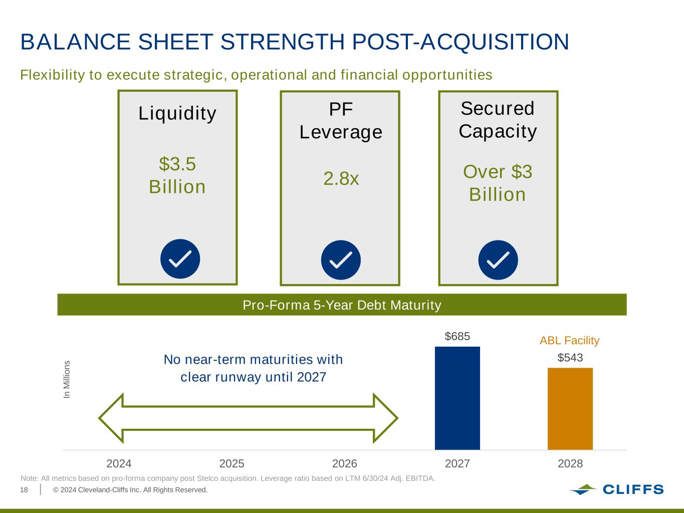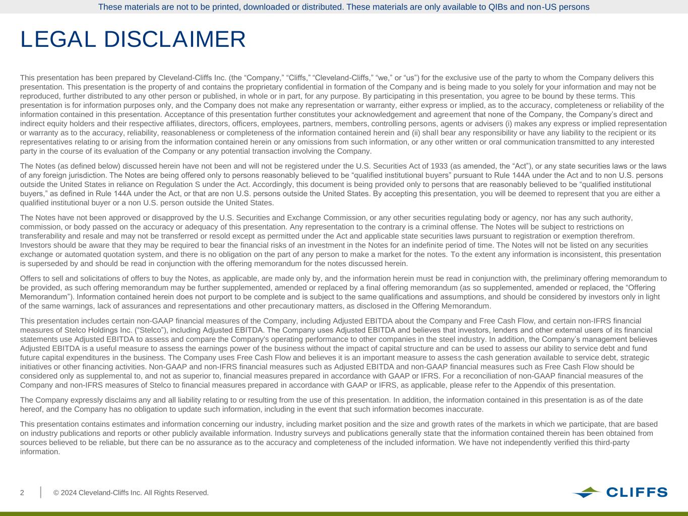 © 2024 Cleveland-Cliffs Inc. All Rights Reserved.2 This presentation has been prepared by Cleveland-Cliffs Inc. (the “Company,” “Cliffs,” “Cleveland-Cliffs,” “we,” or “us”) for the exclusive use of the party to whom the Company delivers this presentation. This presentation is the property of and contains the proprietary confidential in formation of the Company and is being made to you solely for your information and may not be reproduced, further distributed to any other person or published, in whole or in part, for any purpose. By participating in this presentation, you agree to be bound by these terms. This presentation is for information purposes only, and the Company does not make any representation or warranty, either express or implied, as to the accuracy, completeness or reliability of the information contained in this presentation. Acceptance of this presentation further constitutes your acknowledgement and agreement that none of the Company, the Company’s direct and indirect equity holders and their respective affiliates, directors, officers, employees, partners, members, controlling persons, agents or advisers (i) makes any express or implied representation or warranty as to the accuracy, reliability, reasonableness or completeness of the information contained herein and (ii) shall bear any responsibility or have any liability to the recipient or its representatives relating to or arising from the information contained herein or any omissions from such information, or any other written or oral communication transmitted to any interested party in the course of its evaluation of the Company or any potential transaction involving the Company. The Notes (as defined below) discussed herein have not been and will not be registered under the U.S. Securities Act of 1933 (as amended, the “Act”), or any state securities laws or the laws of any foreign jurisdiction. The Notes are being offered only to persons reasonably believed to be “qualified institutional buyers” pursuant to Rule 144A under the Act and to non U.S. persons outside the United States in reliance on Regulation S under the Act. Accordingly, this document is being provided only to persons that are reasonably believed to be “qualified institutional buyers,” as defined in Rule 144A under the Act, or that are non U.S. persons outside the United States. By accepting this presentation, you will be deemed to represent that you are either a qualified institutional buyer or a non U.S. person outside the United States. The Notes have not been approved or disapproved by the U.S. Securities and Exchange Commission, or any other securities regulating body or agency, nor has any such authority, commission, or body passed on the accuracy or adequacy of this presentation. Any representation to the contrary is a criminal offense. The Notes will be subject to restrictions on transferability and resale and may not be transferred or resold except as permitted under the Act and applicable state securities laws pursuant to registration or exemption therefrom. Investors should be aware that they may be required to bear the financial risks of an investment in the Notes for an indefinite period of time. The Notes will not be listed on any securities exchange or automated quotation system, and there is no obligation on the part of any person to make a market for the notes. To the extent any information is inconsistent, this presentation is superseded by and should be read in conjunction with the offering memorandum for the notes discussed herein. Offers to sell and solicitations of offers to buy the Notes, as applicable, are made only by, and the information herein must be read in conjunction with, the preliminary offering memorandum to be provided, as such offering memorandum may be further supplemented, amended or replaced by a final offering memorandum (as so supplemented, amended or replaced, the “Offering Memorandum”). Information contained herein does not purport to be complete and is subject to the same qualifications and assumptions, and should be considered by investors only in light of the same warnings, lack of assurances and representations and other precautionary matters, as disclosed in the Offering Memorandum. This presentation includes certain non-GAAP financial measures of the Company, including Adjusted EBITDA about the Company and Free Cash Flow, and certain non-IFRS financial measures of Stelco Holdings Inc. (“Stelco”), including Adjusted EBITDA. The Company uses Adjusted EBITDA and believes that investors, lenders and other external users of its financial statements use Adjusted EBITDA to assess and compare the Company's operating performance to other companies in the steel industry. In addition, the Company’s management believes Adjusted EBITDA is a useful measure to assess the earnings power of the business without the impact of capital structure and can be used to assess our ability to service debt and fund future capital expenditures in the business. The Company uses Free Cash Flow and believes it is an important measure to assess the cash generation available to service debt, strategic initiatives or other financing activities. Non-GAAP and non-IFRS financial measures such as Adjusted EBITDA and non-GAAP financial measures such as Free Cash Flow should be considered only as supplemental to, and not as superior to, financial measures prepared in accordance with GAAP or IFRS. For a reconciliation of non-GAAP financial measures of the Company and non-IFRS measures of Stelco to financial measures prepared in accordance with GAAP or IFRS, as applicable, please refer to the Appendix of this presentation. The Company expressly disclaims any and all liability relating to or resulting from the use of this presentation. In addition, the information contained in this presentation is as of the date hereof, and the Company has no obligation to update such information, including in the event 