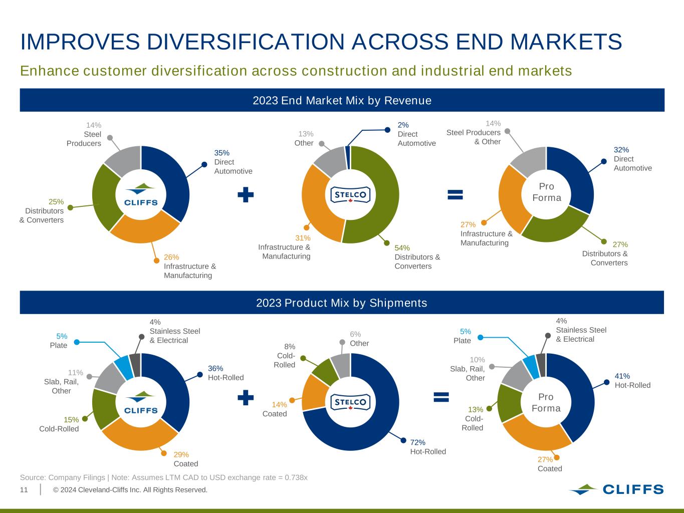 © 2024 Cleveland-Cliffs Inc. All Rights Reserved.10 STELCO’S INDUSTRY LEADING COST ADVANTAGES Iron Ore Supply Agreement Five key drivers of Stelco’s cost advantage: • Favorable-cost pellet agreement • Agreement does not expire until 2028 Currency Advantage Healthcare Costs Optimal Operating Layout Low Energy Rates • Favorable CAD/USD exchange rate • Majority of COGS in CAD • Benefits from Canada’s publicly funded healthcare system • Significantly advantaged healthcare costs relative to U.S. companies • Lake Erie Works is one of the newest integrated facilities on the continent with efficient flow sheet • Two modern internal coke batteries with low-cost and high-quality production • Favorable Ontario power costs • Internal power generation