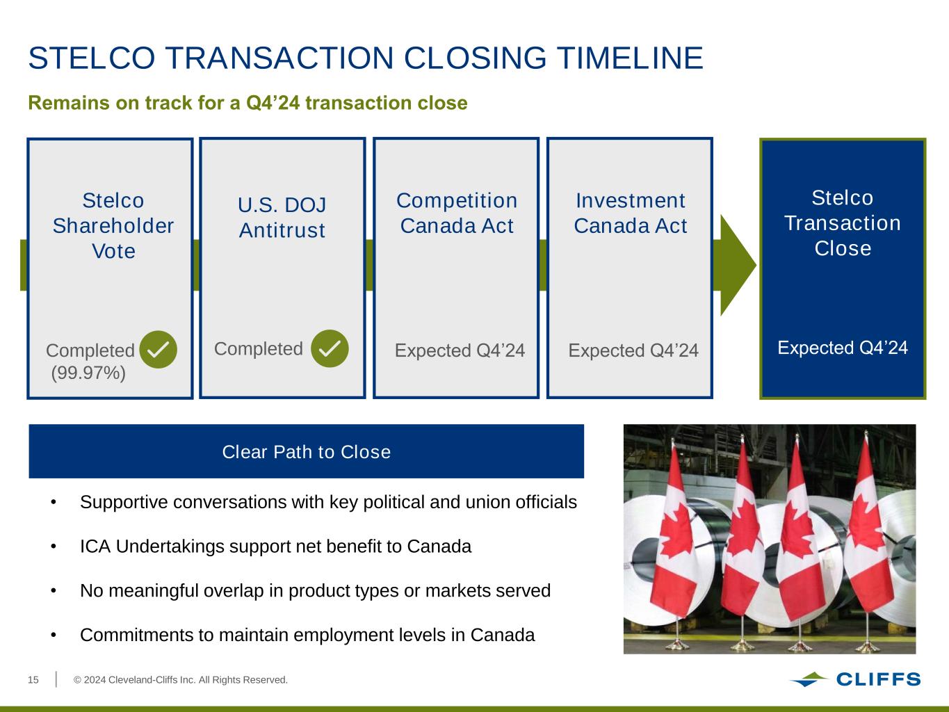 © 2024 Cleveland-Cliffs Inc. All Rights Reserved.15 STELCO TRANSACTION CLOSING TIMELINE Remains on track for a Q4’24 transaction close U.S. DOJ Antitrust Completed Investment Canada Act Expected Q4’24 Stelco Shareholder Vote Completed (99.97%) Stelco Transaction Close Expected Q4’24 Clear Path to Close • Supportive conversations with key political and union officials • ICA Undertakings support net benefit to Canada • No meaningful overlap in product types or markets served • Commitments to maintain employment levels in Canada Competition Canada Act Expected Q4’24