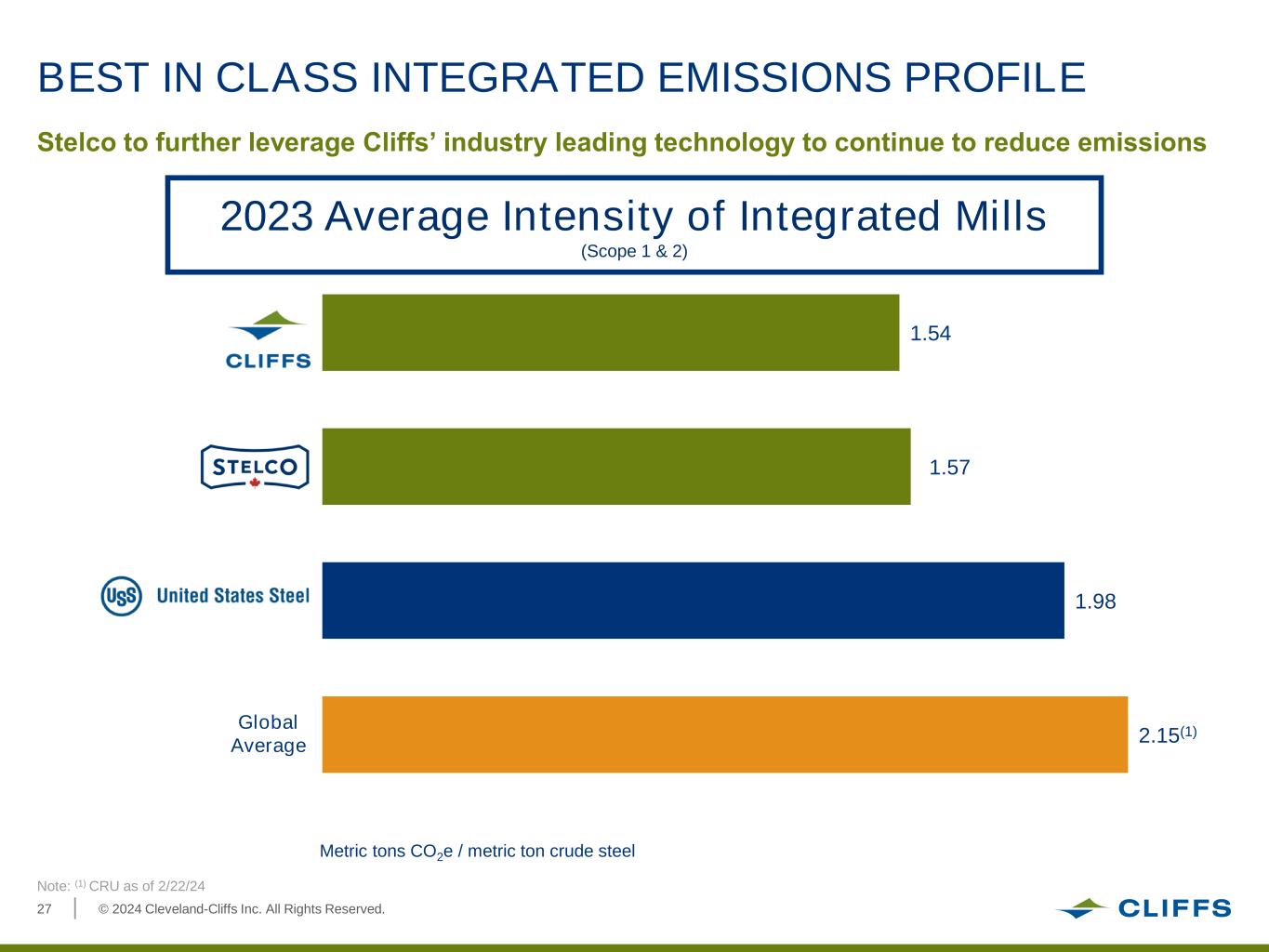 © 2024 Cleveland-Cliffs Inc. All Rights Reserved.26 DOWNSTREAM TRANSFORMER PRODUCTION Weirton, WV selected for manufacturing site of distribution transformer production plant $100 million net investment with $50 million in expected support from West Virginia Economic Development Authority Re-employment opportunities for 600 remaining laid off employees Will produce three-phase distribution transformers to support highly undersupplied market Provides increased demand for American-made GOES produced at Cliffs’ Butler Works steel mill Investment Plans for New Electrical Distribution Transformer Production Plant