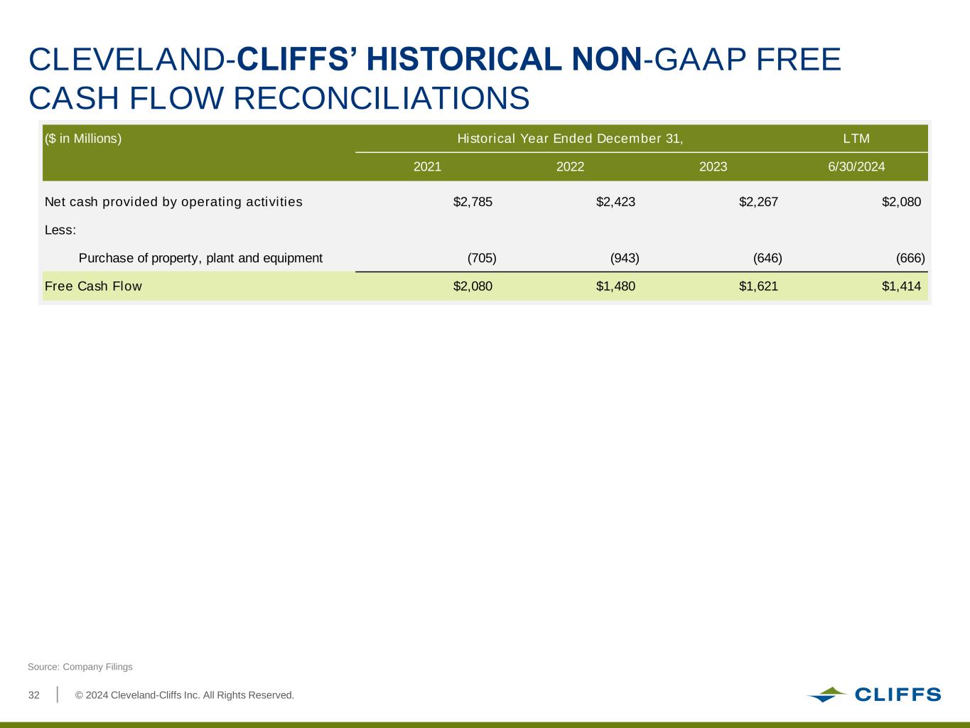 © 2024 Cleveland-Cliffs Inc. All Rights Reserved.32 CLEVELAND-CLIFFS’ HISTORICAL NON-GAAP FREE CASH FLOW RECONCILIATIONS Source: Company Filings ($ in Millions) Historical Year Ended December 31, LTM 2021 2022 2023 6/30/2024 Net cash provided by operating activities $2,785 $2,423 $2,267 $2,080 Less: Purchase of property, plant and equipment (705) (943) (646) (666) Free Cash Flow $2,080 $1,480 $1,621 $1,414