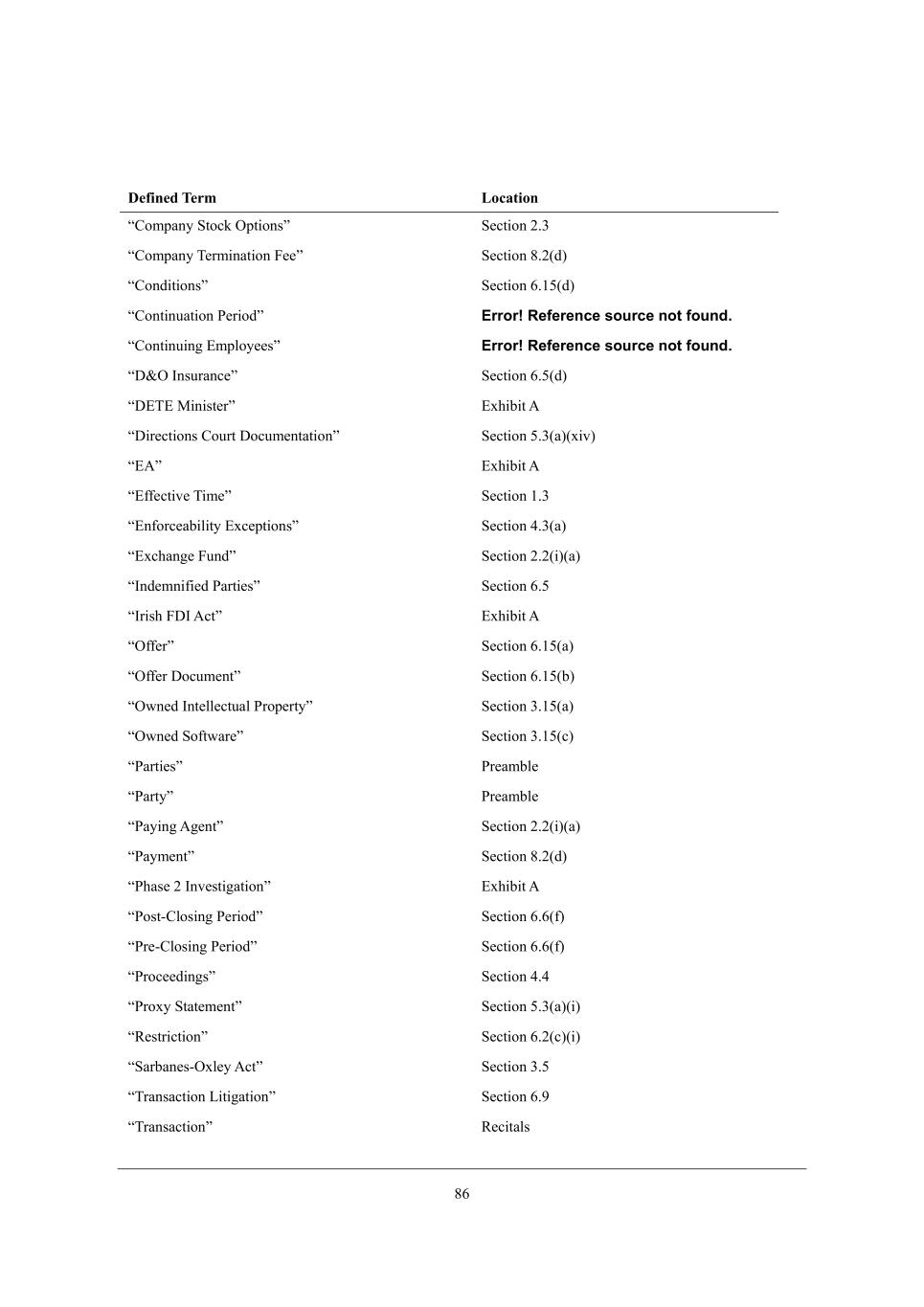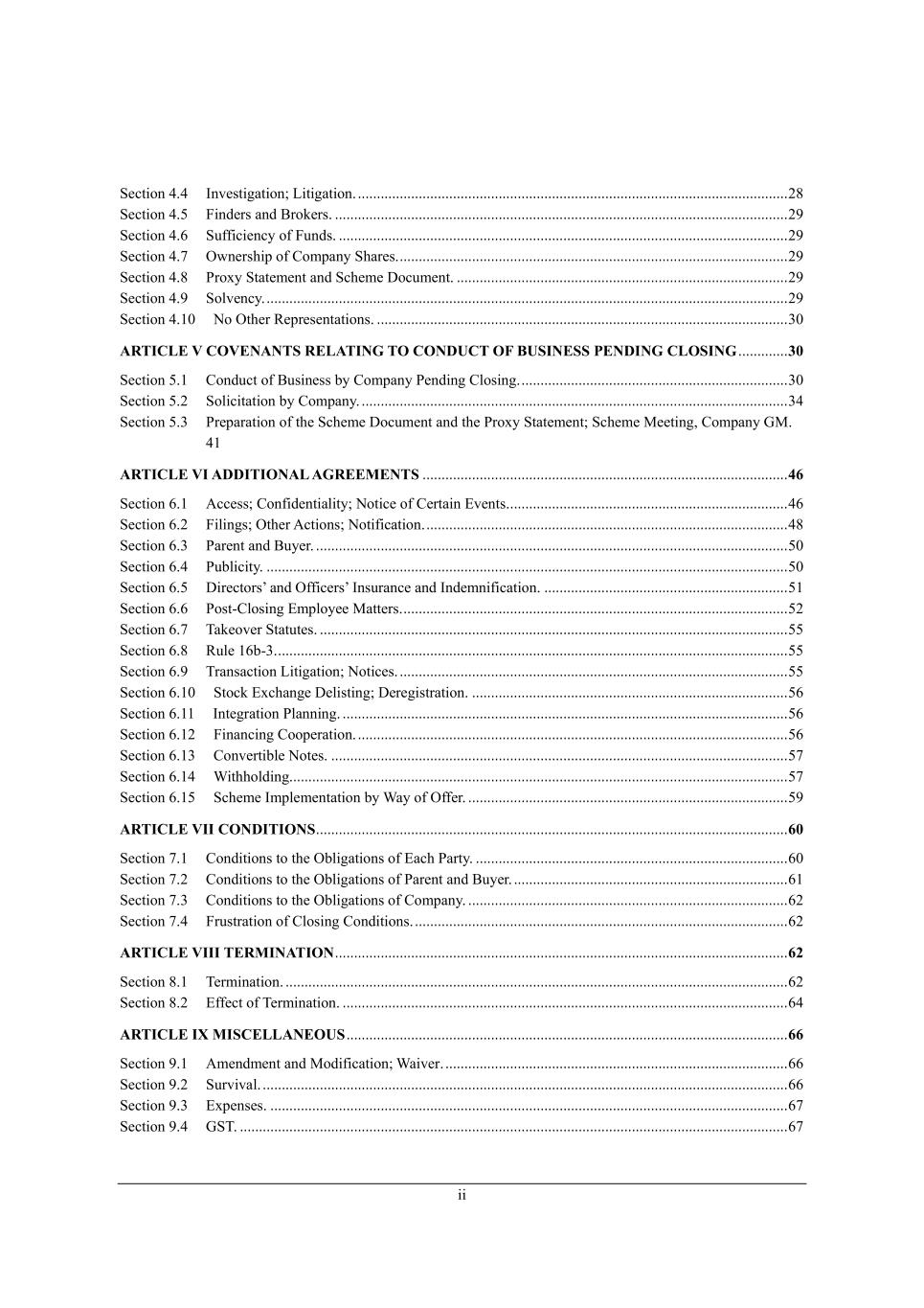 __ M[Yj_ed 2,2 Cdl[ij_]Wj_ed9 F_j_]Wj_ed, ................................................................................................................. 06 M[Yj_ed 2,3 @_dZ[hi WdZ <hea[hi, ....................................................................................................................... 07 M[Yj_ed 2,4 Mk\\_Y_[dYo e\ @kdZi, ...................................................................................................................... 07 M[Yj_ed 2,5 Imd[hi^_f e\ =ecfWdo M^Wh[i, ...................................................................................................... 07 M[Yj_ed 2,6 Jheno MjWj[c[dj WdZ MY^[c[ >eYkc[dj, ....................................................................................... 07 M[Yj_ed 2,7 Mebl[dYo, ......................................................................................................................................... 07 M[Yj_ed 2,/. He Ij^[h L[fh[i[djWj_edi, ............................................................................................................ 1. ARTICLE V COVENANTS RELATING TO CONDUCT OF BUSINESS PENDING CLOSING ............. 30 M[Yj_ed 3,/ =edZkYj e\ <ki_d[ii Xo =ecfWdo J[dZ_d] =bei_d], ...................................................................... 1. M[Yj_ed 3,0 Meb_Y_jWj_ed Xo =ecfWdo, ................................................................................................................ 12 M[Yj_ed 3,1 Jh[fWhWj_ed e\ j^[ MY^[c[ >eYkc[dj WdZ j^[ Jheno MjWj[c[dj9 MY^[c[ G[[j_d]* =ecfWdo AG, 2/ ARTICLE VI ADDITIONAL AGREEMENTS ................................................................................................ 46 M[Yj_ed 4,/ ;YY[ii9 =ed\_Z[dj_Wb_jo9 Hej_Y[ e\ =[hjW_d ?l[dji, ......................................................................... 24 M[Yj_ed 4,0 @_b_d]i9 Ij^[h ;Yj_edi9 Hej_\_YWj_ed, ............................................................................................... 26 M[Yj_ed 4,1 JWh[dj WdZ <ko[h, ............................................................................................................................ 3. M[Yj_ed 4,2 JkXb_Y_jo, ......................................................................................................................................... 3. M[Yj_ed 4,3 >_h[Yjehiu WdZ I\\_Y[hiu CdikhWdY[ WdZ CdZ[cd_\_YWj_ed, ................................................................ 3/ M[Yj_ed 4,4 Jeij+=bei_d] ?cfbeo[[ GWjj[hi, ..................................................................................................... 30 M[Yj_ed 4,5 NWa[el[h MjWjkj[i, ........................................................................................................................... 33 M[Yj_ed 4,6 Lkb[ /4X+1, ...................................................................................................................................... 33 M[Yj_ed 4,7 NhWdiWYj_ed F_j_]Wj_ed9 Hej_Y[i, ...................................................................................................... 33 M[Yj_ed 4,/. MjeYa ?nY^Wd][ >[b_ij_d]9 >[h[]_ijhWj_ed, ................................................................................... 34 M[Yj_ed 4,// Cdj[]hWj_ed JbWdd_d], ..................................................................................................................... 34 M[Yj_ed 4,/0 @_dWdY_d] =eef[hWj_ed, ................................................................................................................. 34 M[Yj_ed 4,/1 =edl[hj_Xb[ Hej[i, ........................................................................................................................ 35 M[Yj_ed 4,/2 Q_j^^ebZ_d], .................................................................................................................................. 35 M[Yj_ed 4,/3 MY^[c[ Ccfb[c[djWj_ed Xo QWo e\ I\\[h, .................................................................................... 37 ARTICLE VII CONDITIONS ............................................................................................................................ 60 M[Yj_ed 5,/ =edZ_j_edi je j^[ IXb_]Wj_edi e\ ?WY^ JWhjo, .................................................................................. 4. M[Yj_ed 5,0 =edZ_j_edi je j^[ IXb_]Wj_edi e\ JWh[dj WdZ <ko[h, ........................................................................ 4/ M[Yj_ed 5,1 =edZ_j_edi je j^[ IXb_]Wj_edi e\ =ecfWdo, .................................................................................... 40 M[Yj_ed 5,2 @hkijhWj_ed e\ =bei_d] =edZ_j_edi, .................................................................................................. 40 ARTICLE VIII TERMINATION ....................................................................................................................... 62 M[Yj_ed 6,/ N[hc_dWj_ed, .................................................................................................................................... 40 M[Yj_ed 6,0 ?\\[Yj e\ N[hc_dWj_ed, ..................................................................................................................... 42 ARTICLE IX MISCELLANEOUS .................................................................................................................... 66 M[Yj_ed 7,/ ;c[dZc[dj WdZ GeZ_\_YWj_ed9 QW_l[h, .......................................................................................... 44 M[Yj_ed 7,0 Mkhl_lWb, .......................................................................................................................................... 44 M[Yj_ed 7,1 ?nf[di[i, ........................................................................................................................................ 45 M[Yj_ed 7,2 AMN, ................................................................................................................................................ 45